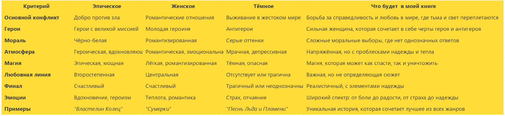 Чтобы лучше понять, как эти жанры сочетаются в моей книге, я создал таблицу, которая поможет вам увидеть их особенности, преимущества и различия.