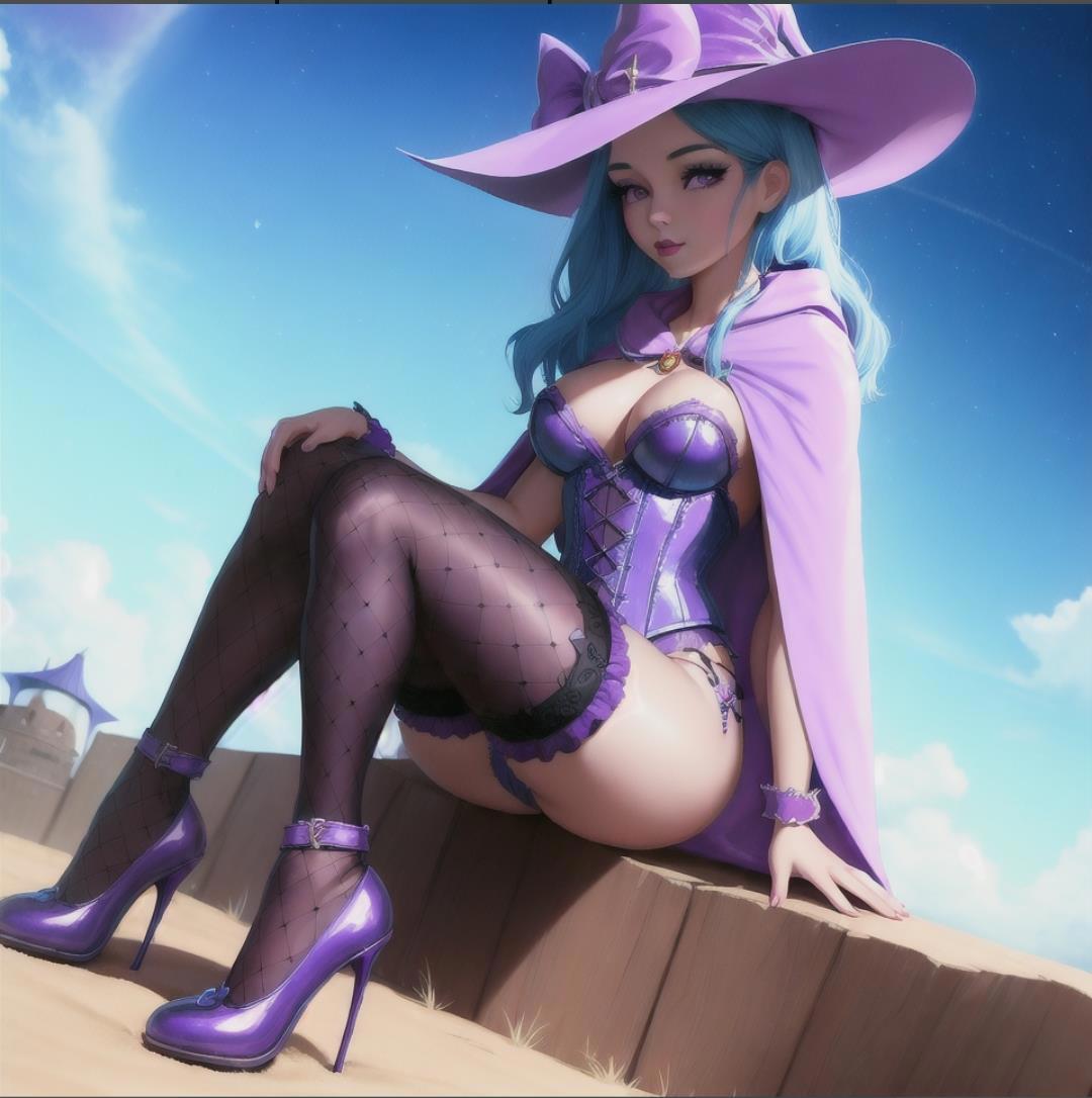 Дверь в приёмную распахивается с такой драматичностью, будто сама судьба решила заглянуть на минутку, чтобы узнать, чем тут занимаются. Вслед за этим раздаётся легкий хлопок, и врывается густой фиолетовый дым, сверкающий искрами, как звёздное небо в ночи. Из этого таинственного тумана медленно проступает силуэт – стройная фигура в развевающемся плаще, я остроконечной шляпе, тугом корсете и голубых трусиках.