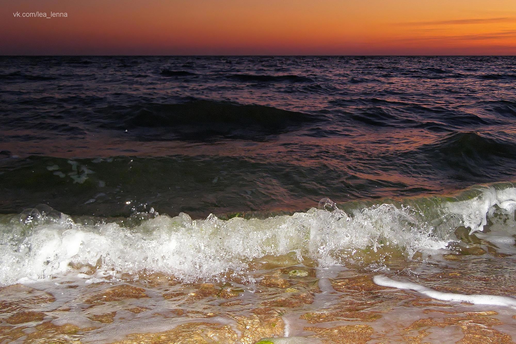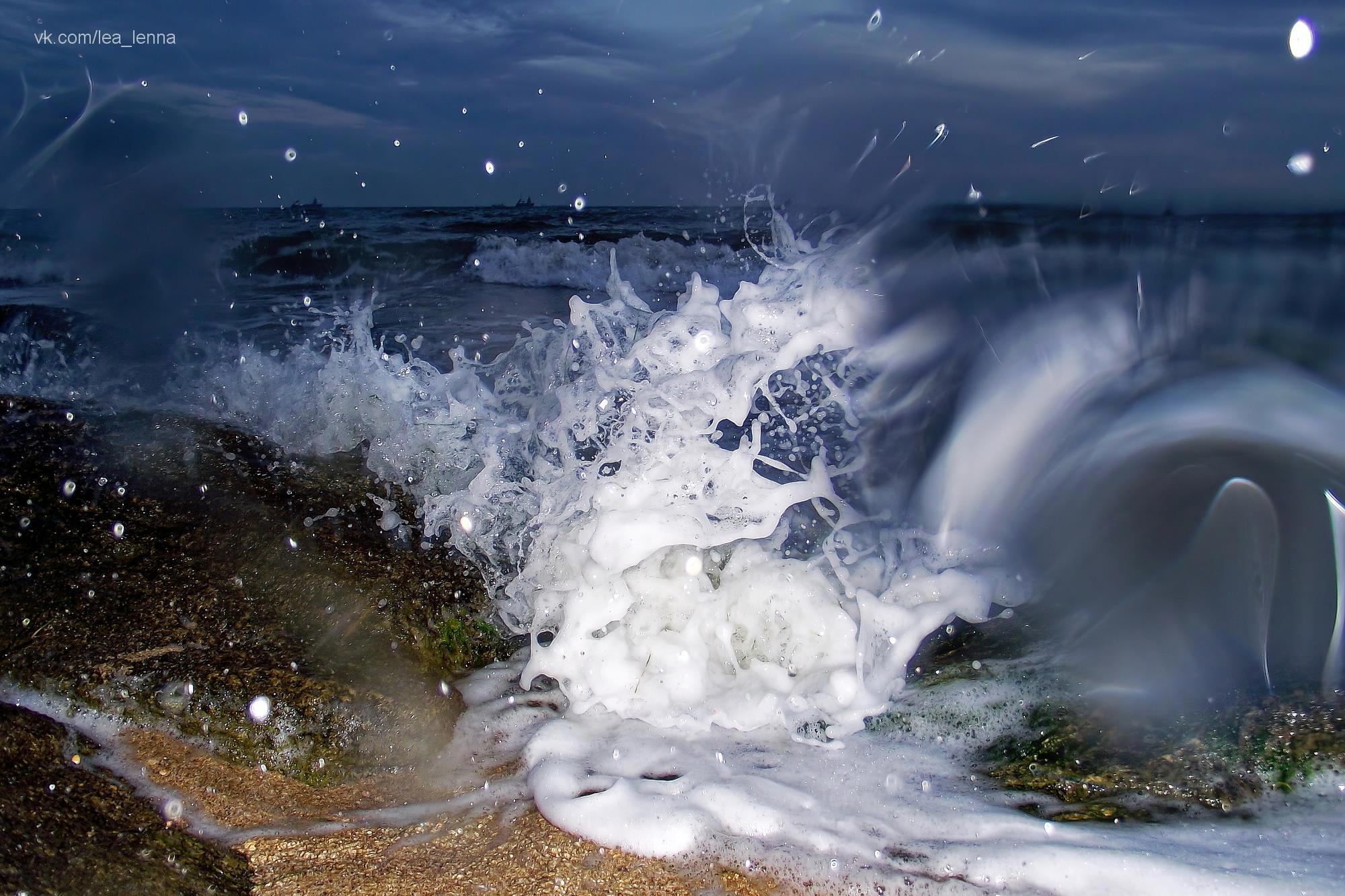 Снимок с историей))) Почти полная темнота, отличный пенный прибой, ветер. Вспышка. Одна из волн угодила прямо в фотоаппарат и в меня, конечно. Так что домой я ехала в мокрых выше колена джинсах, а фотоаппарат лежал в рюкзаке, замотанный в сто слоев туалетной бумаги - очень полезный лайфхак для мокрых прогулок. Дома выяснилось, что капли на линзе создали мне волшебную волну.