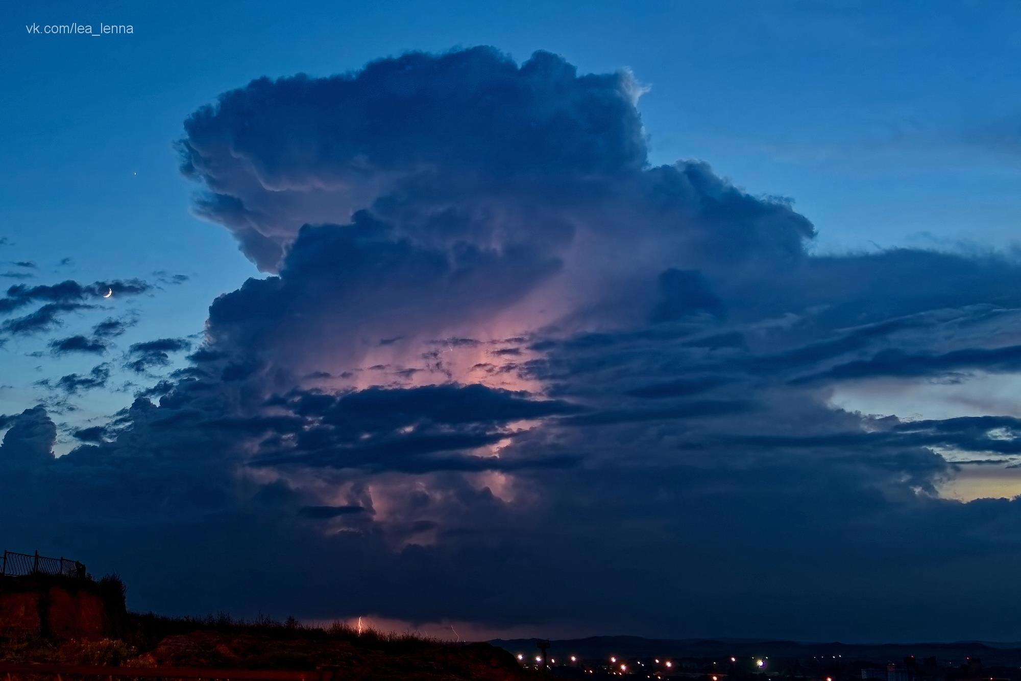 В главе есть ночные облака с луной, светом и даже маленькими лунными радугами. Снять или даже увидеть лунную радугу - ну уж очень большая удача, тем более, если рядом нет водопадов типа Ниагарского. А вот под слепой ночной дождь я попадала, и слепой снегопад - дневной и ночной - видела тоже, дневной даже снимала. А если вернуться к снимку, то вот на нем есть месяц, вечерняя звезда, затухающая закатная заря и полный облачный мешок молний - парочка нижних попали в кадр, другие сверкали в самой глубине тучи и от них этот дивный розовый свет.