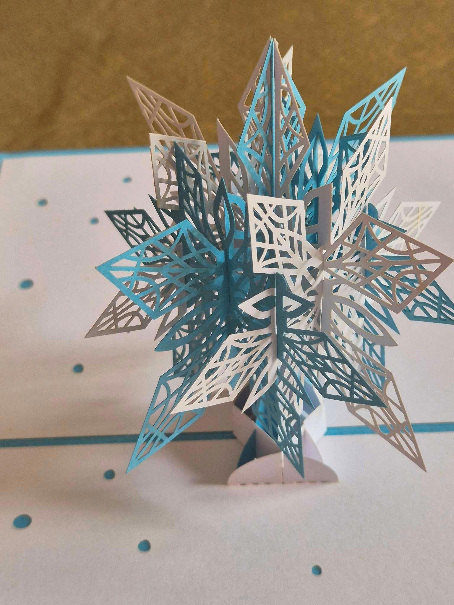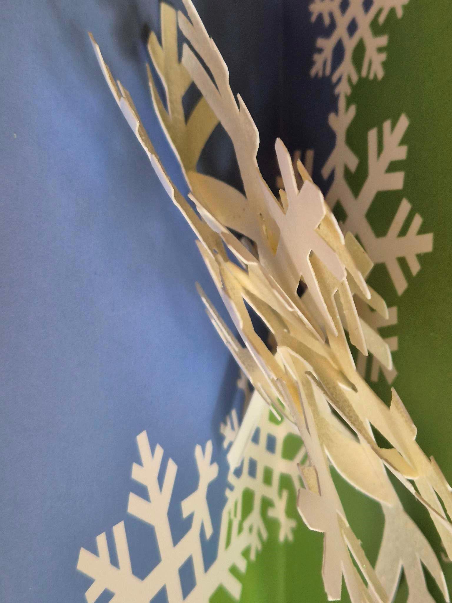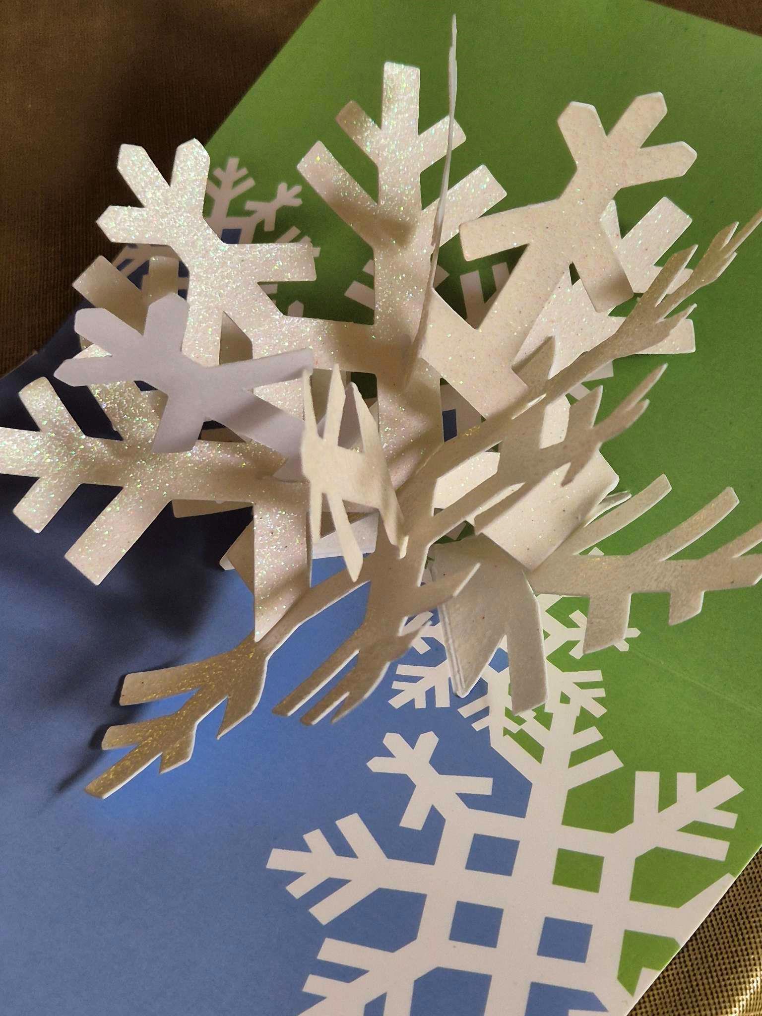 У меня сейчас под рукой есть снежинки (не могу пройти мимо, очень люблю объемные открытки, покупаю, а когда-то сама простые вырезала)