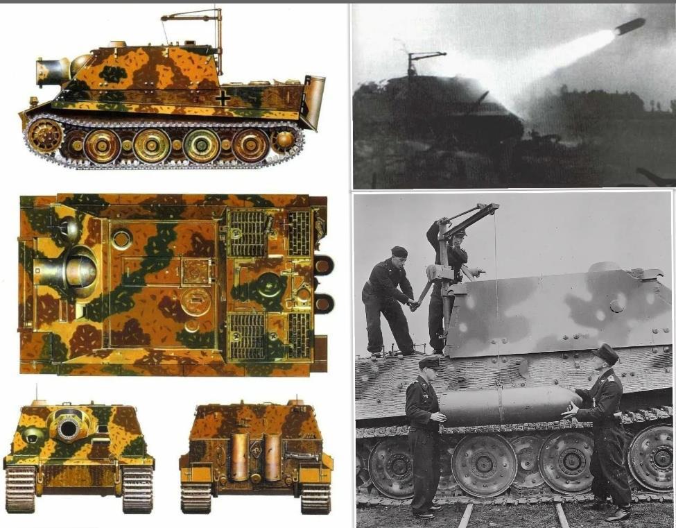 Шпеер кстати, был к сожалению толковый дядька, не будь его у кормила ВПК Рейха, война бы кончилась на пол года раньше. Короче Шпеер не стал тянуть резину, взял базу танка Тигр, по ставил на неё морской суперкарамультук не пригодившийся Кригсимарин - 380-мм реактивный корабельный бомбомёт Raketenwerfer 61. Пускающий четырехсот килограммовую ракету на пять километров, со скорострельностью шесть выстрелов в час.