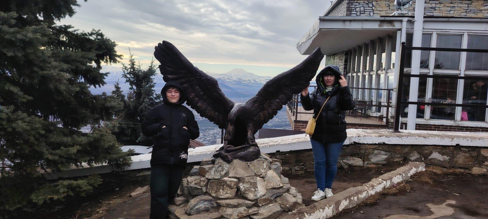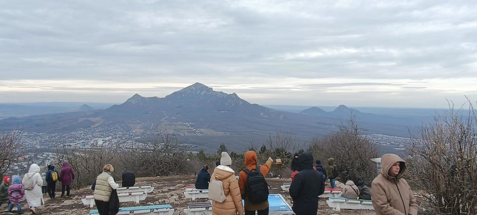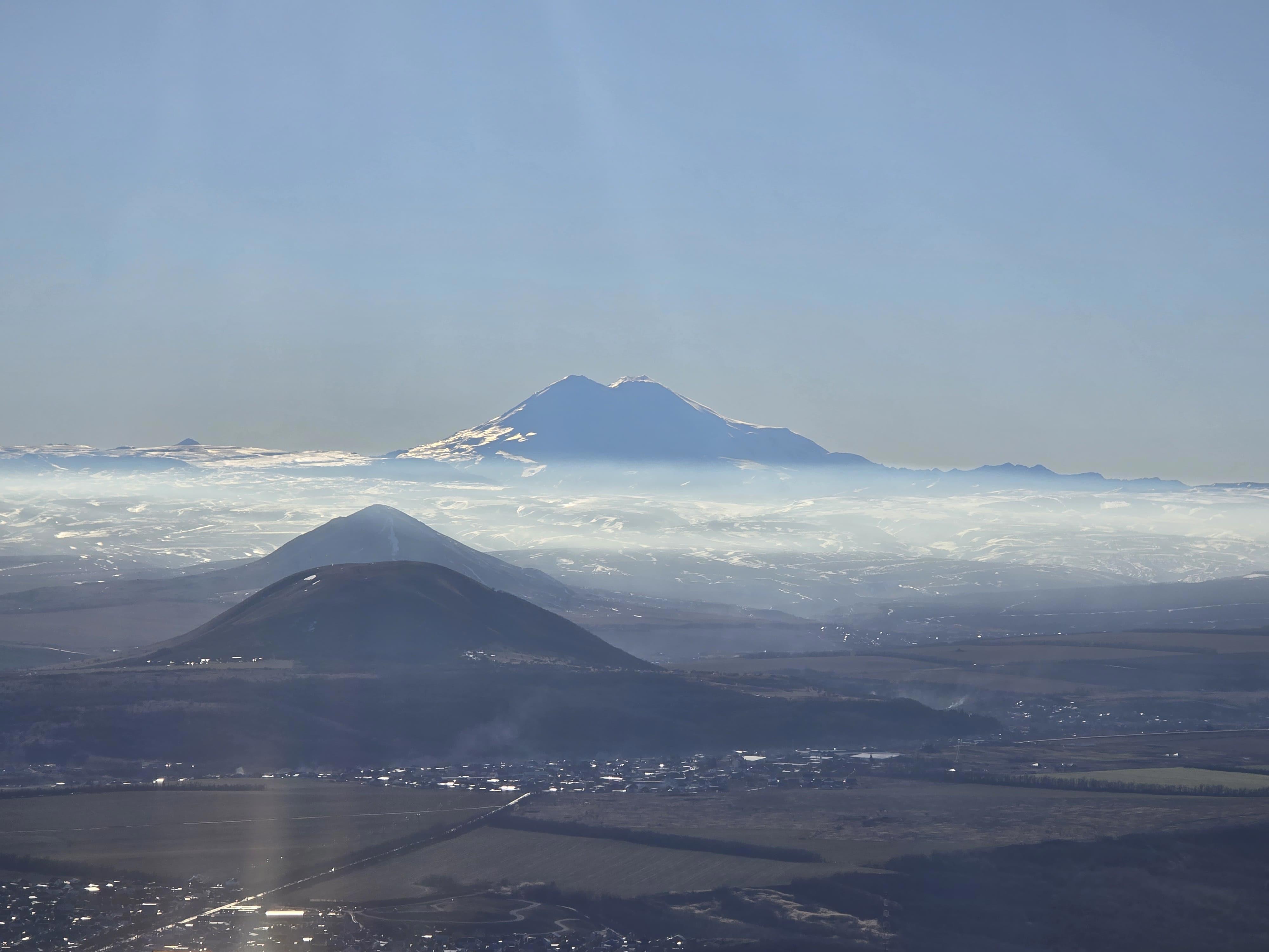 Но вся наша усталость была вознаграждена шикарной панорамой, которая открылась взору! Город остался далеко внизу. А глазам открылся широкий простор. По линии горизонта разместился великий Кавказский хребет, над которым гордо возвышался безмолвный Эльбрус.