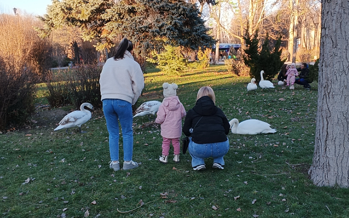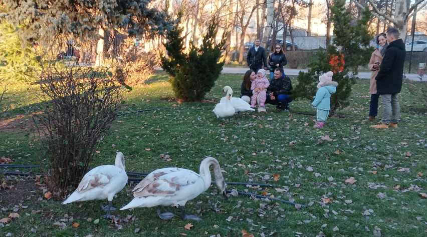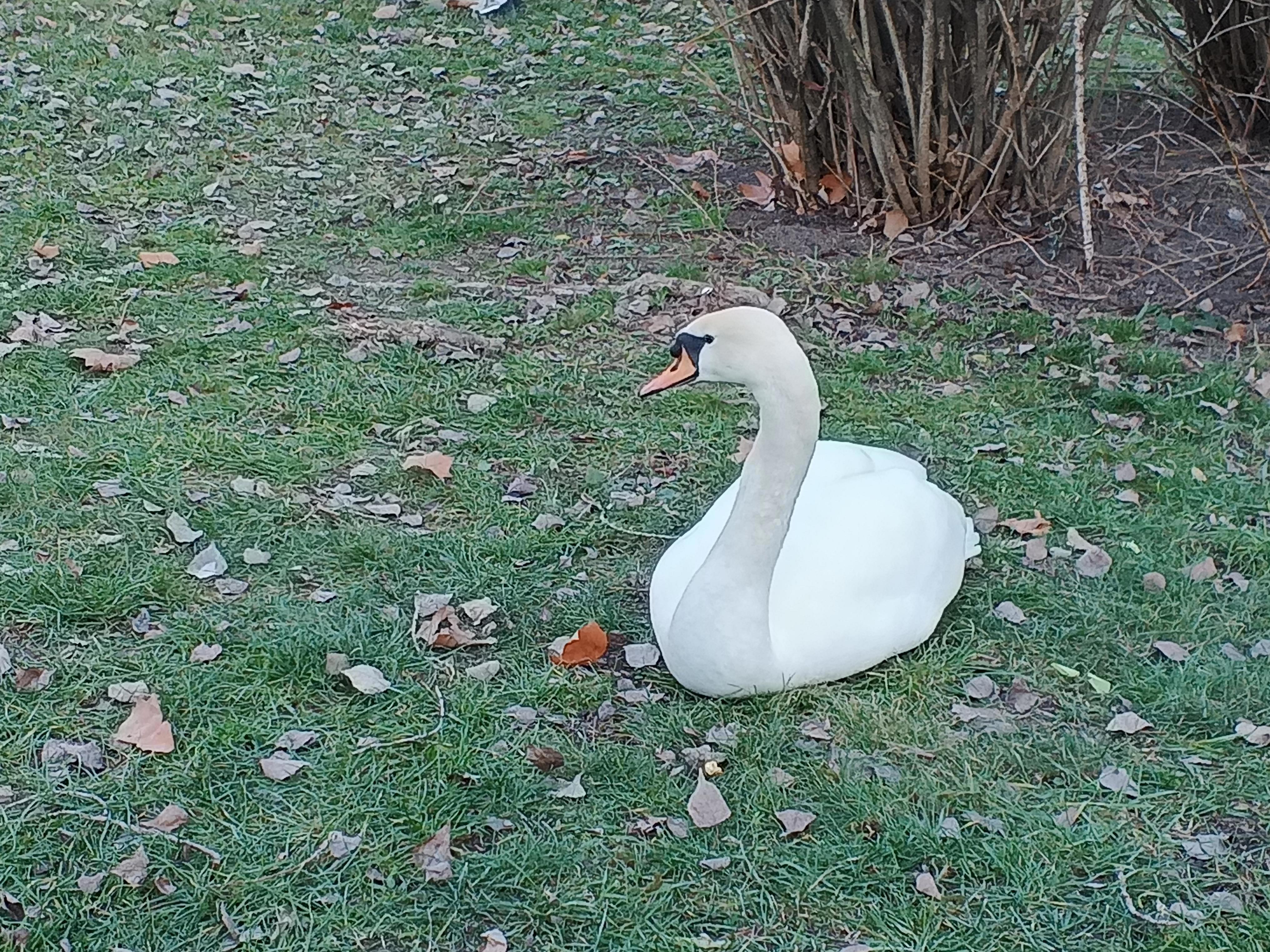 Гуляя по дорожкам вокруг пруда, мы не могли понять, куда делись лебеди и тут, мы обнаружили наших любимых приц на газоне. Лебеди - молодые и более взрослые, вольготно расположились на траве между деревьев и кустов роз. Вокруг собрались люди, очень многие с детьми. Всем хорошо, все довольны.