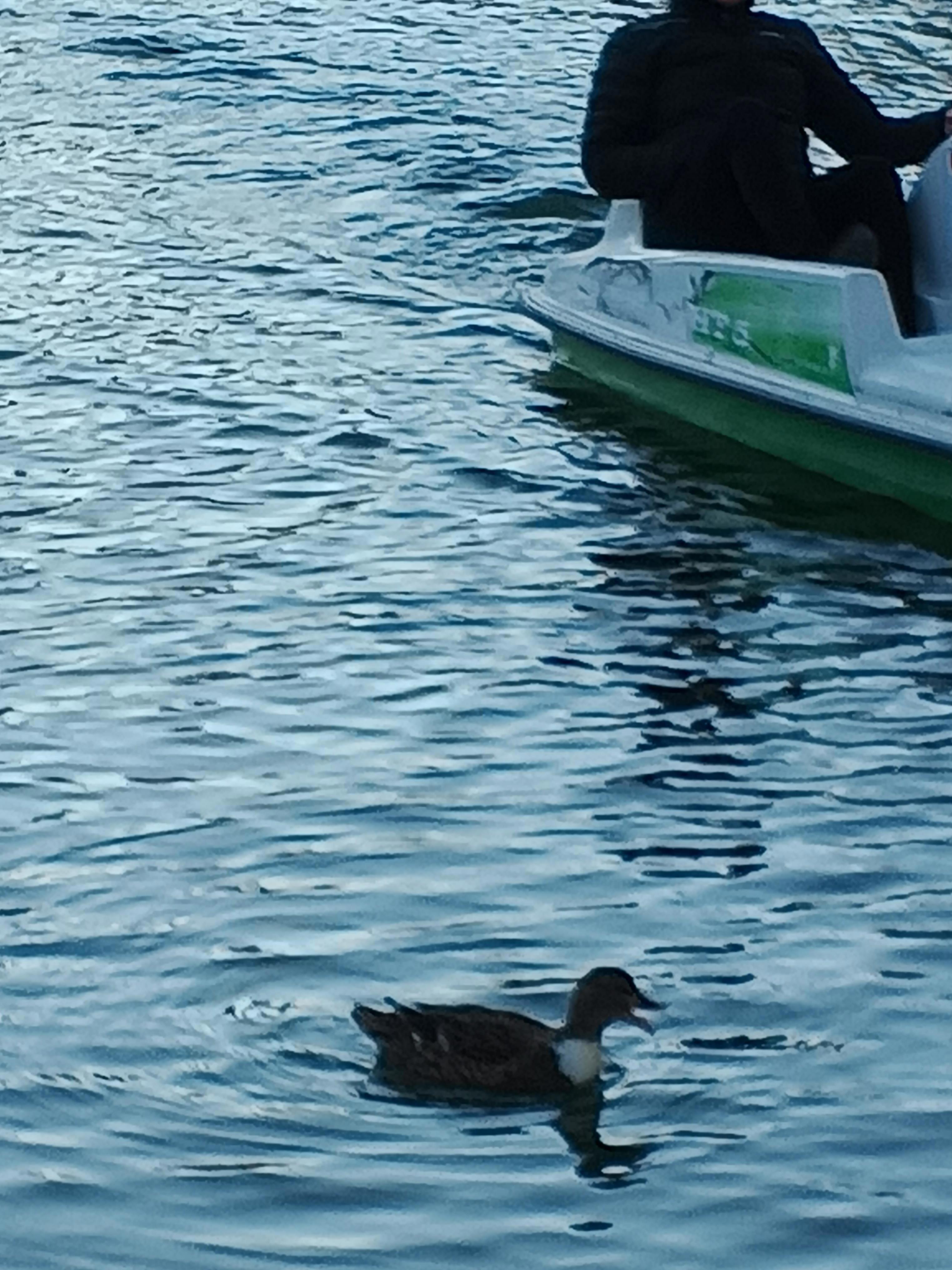 Здесь же мы обнаружили очаровательную уточку с белой грудкой. Неожиданно и очень красиво. Утка, кстати, в отличии он беляночки, мыслями о диете не заморачивается, лопает всё, что ей кидали или что попало в поле её зрения.