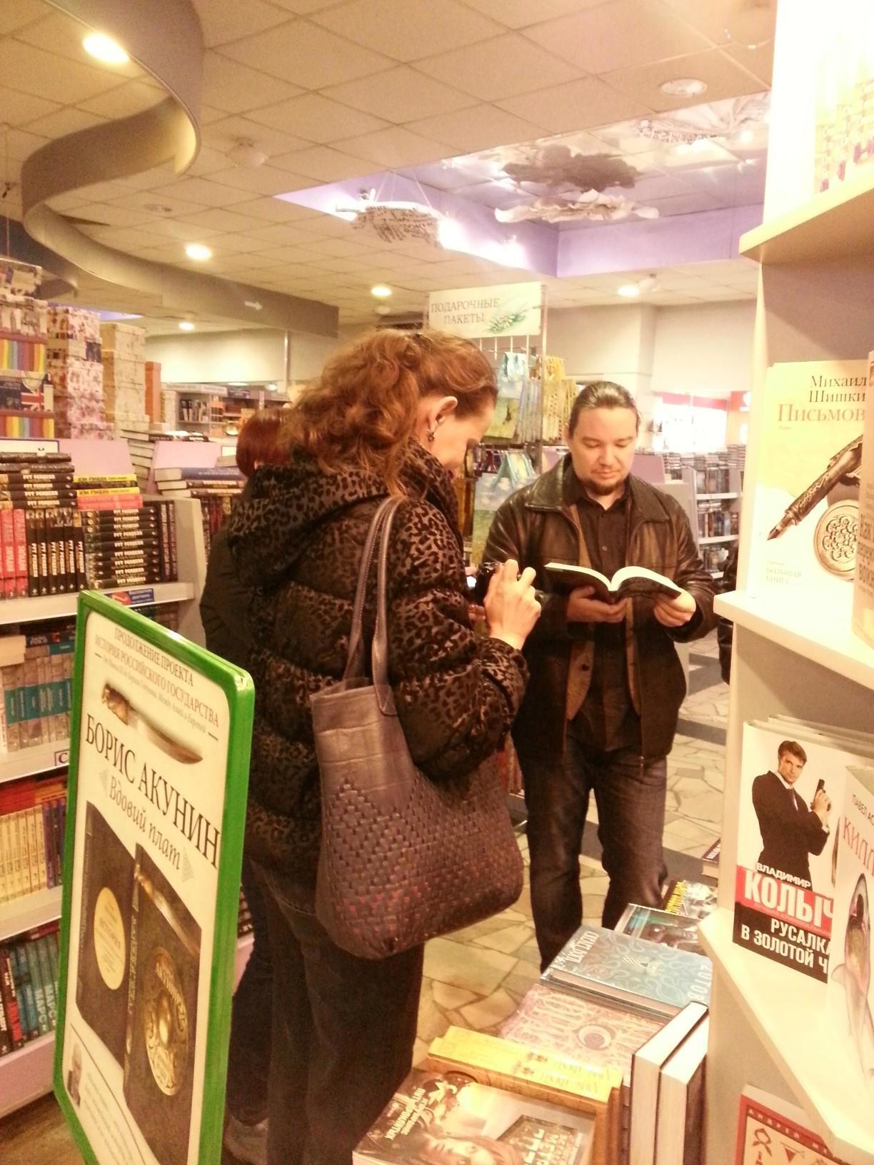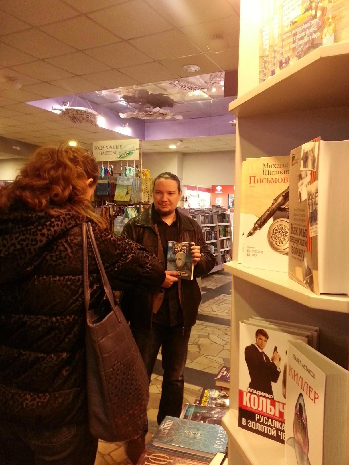 Пока все подтягиваются к назначенному времени, можно побродить по залу и подержать в руках свой же роман, взятый с полки книжного магазина)
