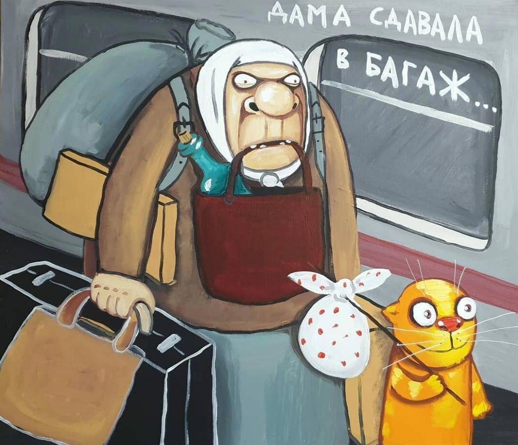 У этих дам всегда столько багажа... но куда она дела маленькую собачонку? И кот как-то уж подозрительно веселый...