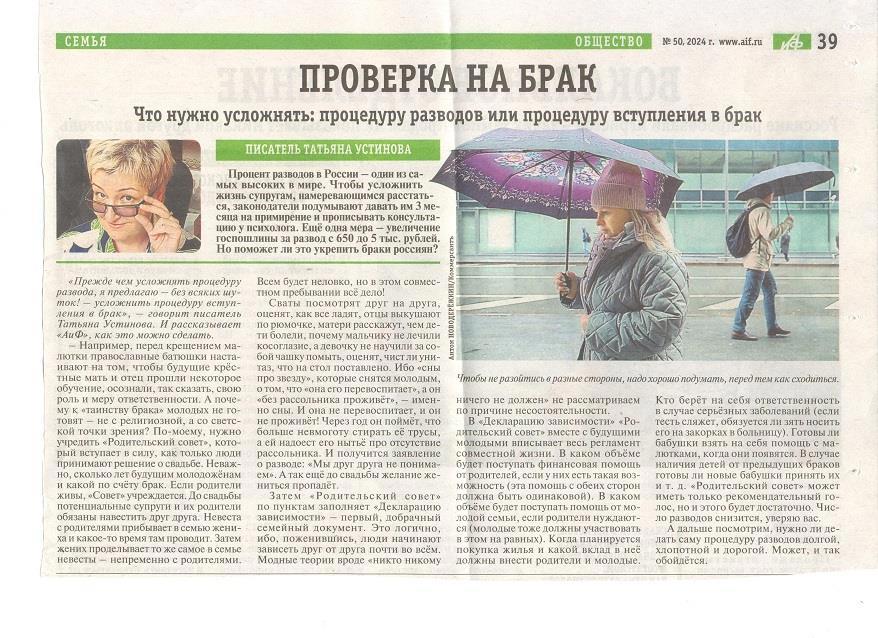 Автор: Николай ВладимировВ газете «Аргументы и факты» за № 50 от 11 декабря 2024 года статья (или заметка) писательницы, автора детективов Татьяны Устиновой «Проверка на брак». Предлагается, чтобы ответственность за создание и сохранение семьи несли не только сами молодые люди – парень с девушкой, но ещё и их родители. Дама вроде как неглупая – хотя бы потому, что успешная, популярные детективы пишет, печатается и вроде как даже экранизируется, а тут такой вздор «на гора» выдала.