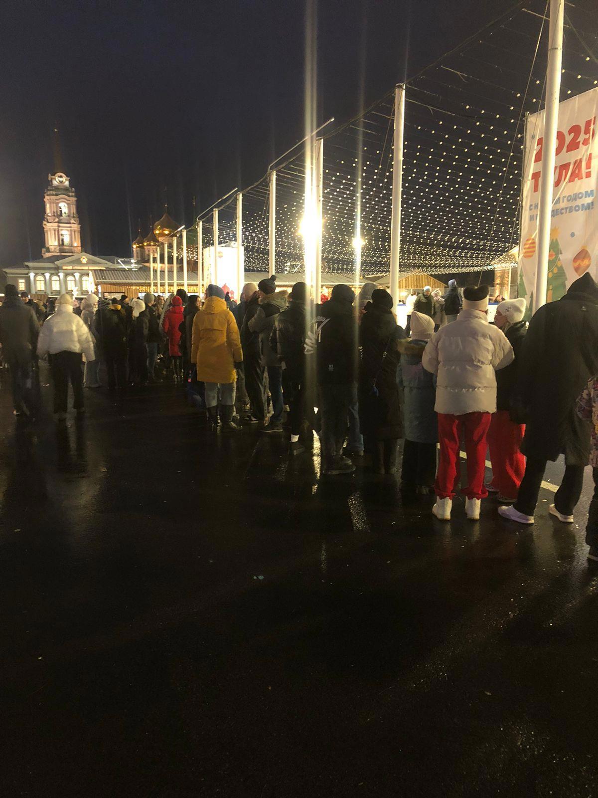 Покататься на коньках вечерком? Без проблем! Вот эта, "уходящая в даль очередь - это на каток.