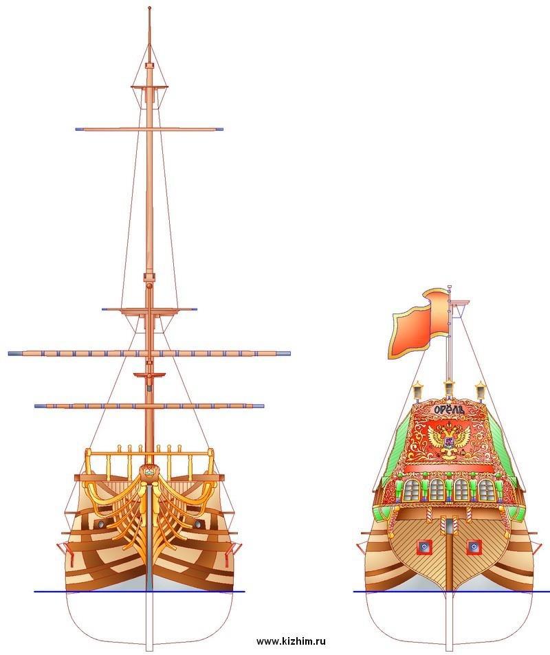 Хотя для полноты картинки можно и «Орла» вспомнить. Чтобы не повторяться всё же, показываю, как выглядел этот корабль согласно нашей реконструкции с носа и с кормы: