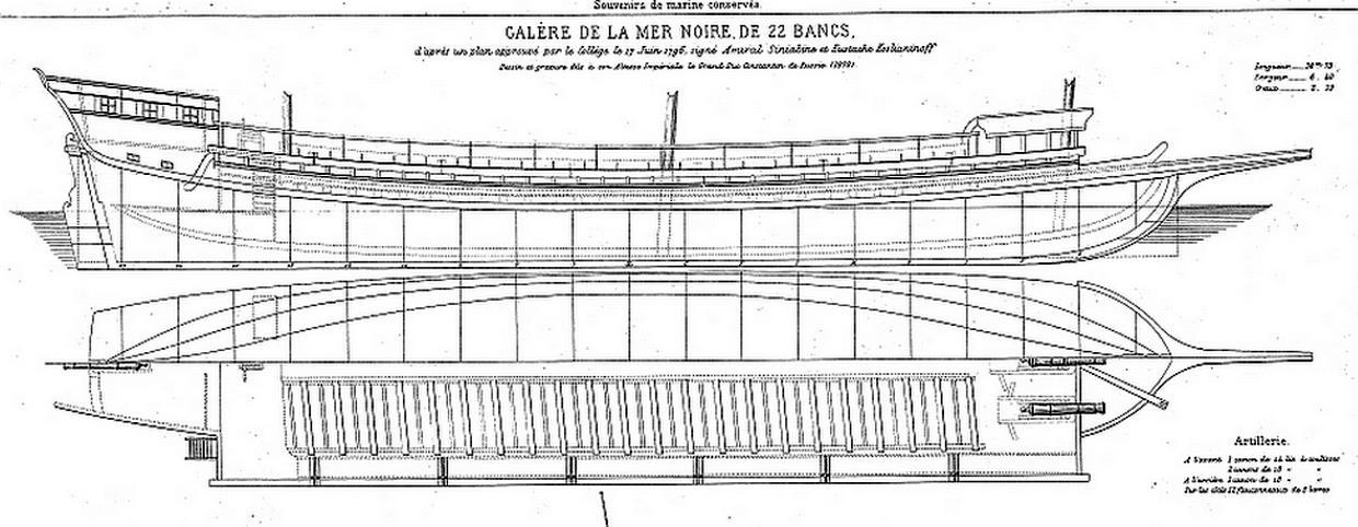Посмотрите внимательнее на картину современника событий и на это новенькое полотно. Явно видно различие в конструкции «галер» – хитровыгнутый форштевень на новой картине и прямой на старинной гравюре. Всё верно – в старину художник рисовал то, что видел, и это – будара. А современный нарисовал, то, что велели, то есть использовал сохранившиеся чертежи настоящих южных галер. Они именно так и выглядели – чертежи, хоть и чуть более поздних времён, сохранились. Трудно сейчас судить о том, что происходило на верфях, где собрались мастера из Воронежа, Архангельска и других краёв. Однако большинство из них привыкли именно к простым и надёжным формам – переучиваться и усложнять времени не было. Исходя из этой старинной гравюры, самая верная из сегодняшних реконструкций вот эта: