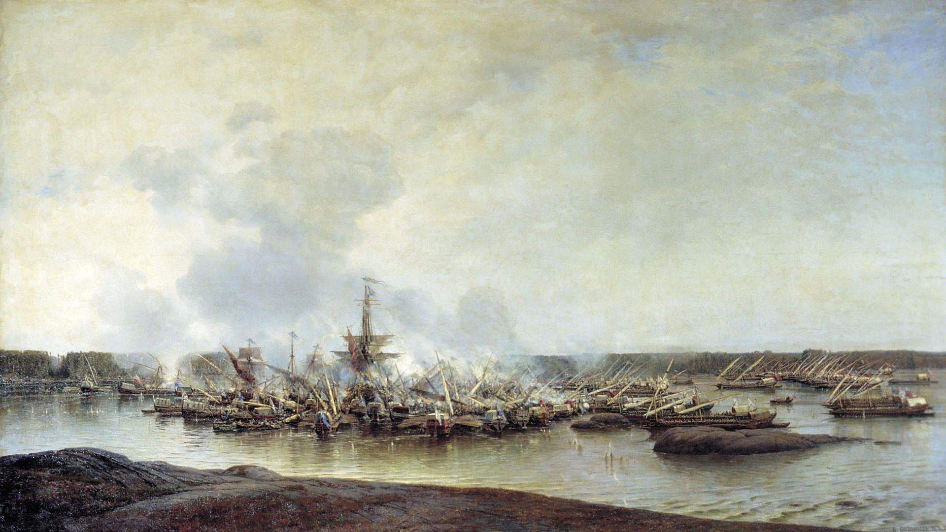 Мелкие конструктивные различия особого значения не имели. Молодой Государь со своей командой всё сделал правильно. То есть, когда сейчас начинают говорить о приоритетном строительстве Петром океанских кораблей по зарубежным лекалам, то это попросту профанация вопроса. На самом деле всё было несколько сложнее. Регулярный Российский Флот начинался на самом деле совсем с других кораблей и первые громкие победы были одержаны совсем не с помощью больших линейных кораблей, а всё на тех же бударах-галерах. Так было под Азовом, так было, когда Ладогу чистили от шведов, так было и под Гангутом. Вот картина времён Петра, посвящённая этому событию: