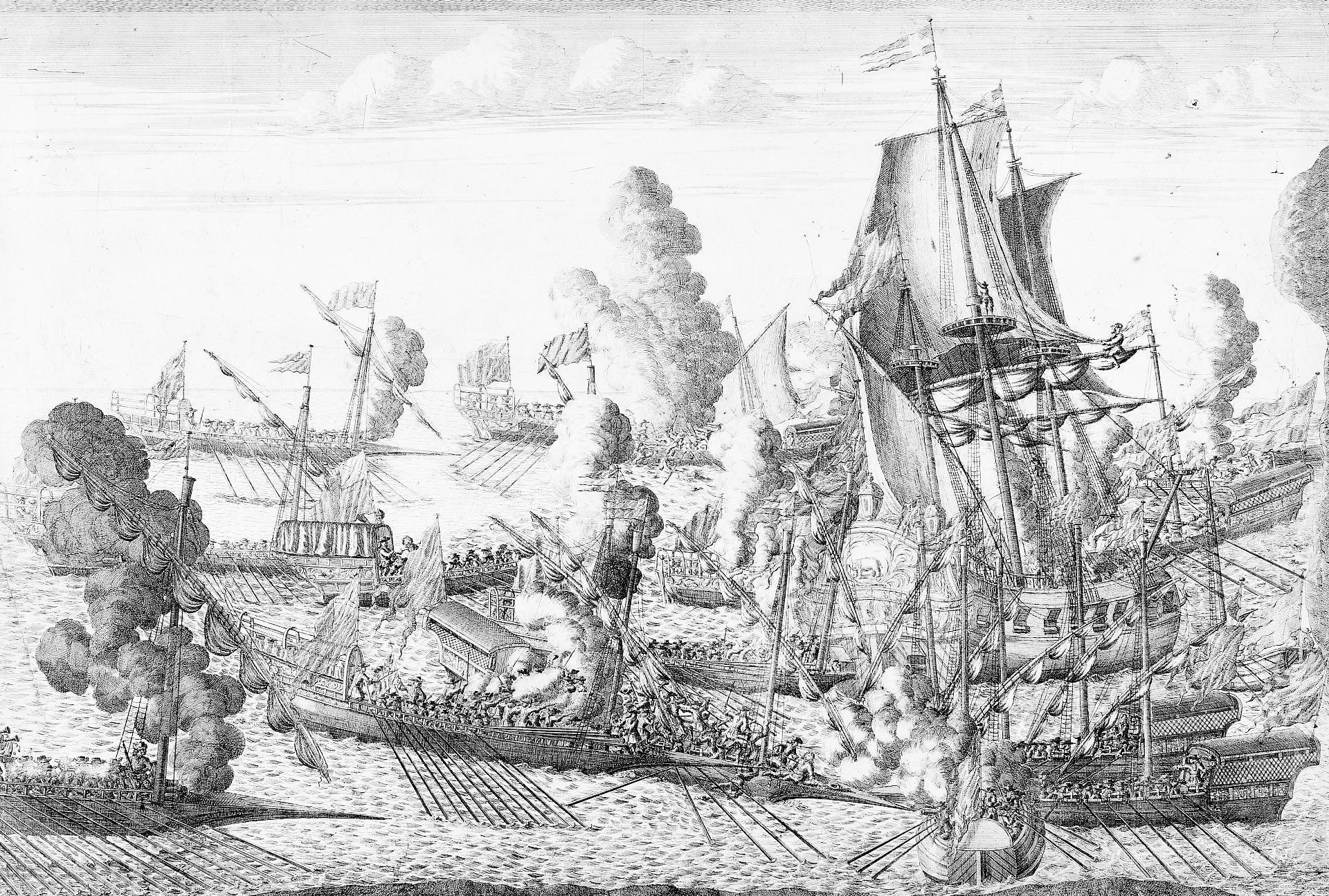 На самом исходе века, в 1696 году Азовский поход увенчался успехом и это была очень большая победа, хотя её иногда пытаются принизить – мол, сил едва хватило на одну крепость. На самом деле сил хватило на всё ещё мощную Турецкую империю. Две попытки, большие потери, но тут уж ничего не поделаешь – опыт всегда стоит недёшево. В плане флота здесь интересна вот эта гравюра, нарисованная по горячем следам события: