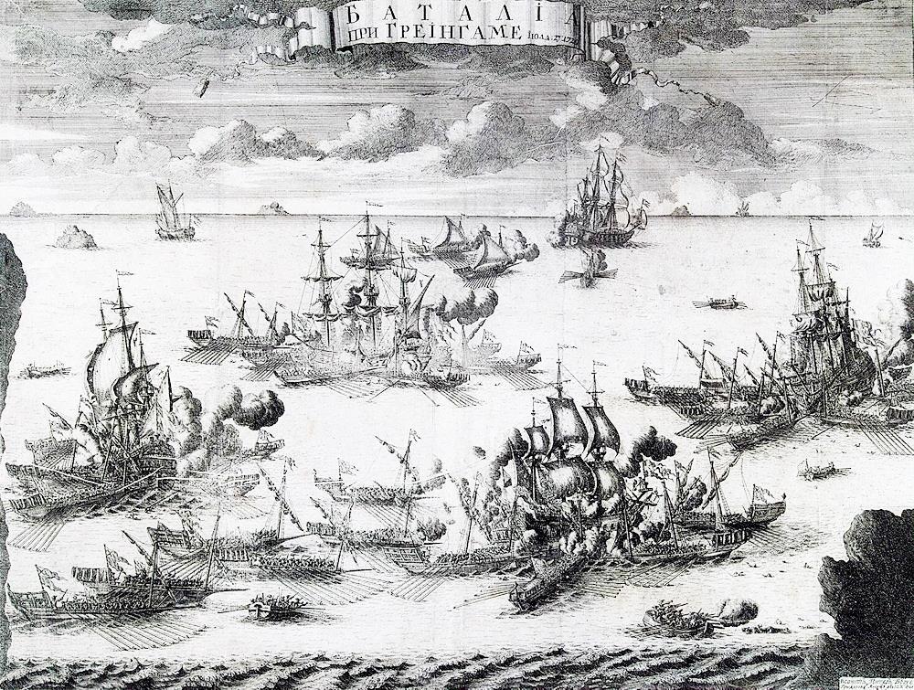 Вот на этой старинной русской гравюре показан эпизод боя при Гангуте. Здесь хорошо видны действия отдельных кораблей: