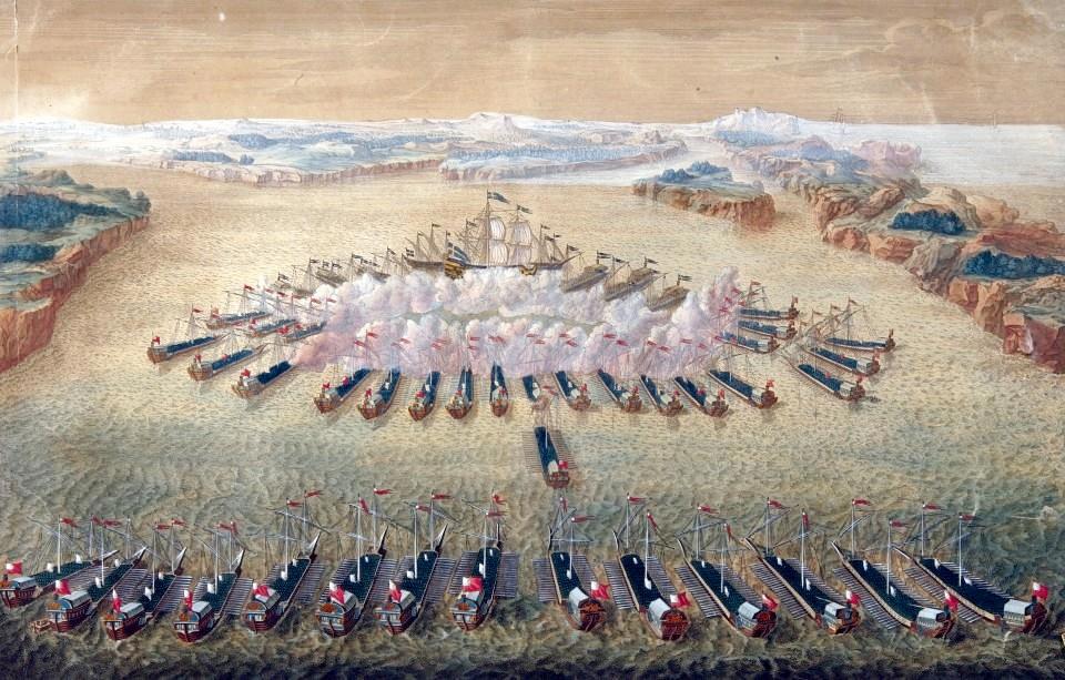 Как видите на один единственный корабль европейского типа приходится аж целых шесть «галер». Причём именно эти так называемые «галеры» и занимаются основной боевой работой, а большой корабль используется только для артиллерийской поддержки. И это естественно – с его осадкой далеко за два метра он никогда не смог бы подойти достаточно близко к берегу. На самом деле соотношение по количеству типов судов было намного серьёзнее. По дошедшим сведениям, было построено 22 галеры, 1300 стругов (видимо грузовых плоскодонных судов для перевозки войск), брандеры, плоты и всего два корабля «западного строя» – «Апостол Павел» и «Апостол Пётр». В описании боёв также сообщается об уничтожении двух турецких галер и неназванного количества «мелких судов». Это означает, что турки тоже имели на вооружении аналогичные корабли. Вот ещё одна картина, уже современная, посвящённая этому же событию: