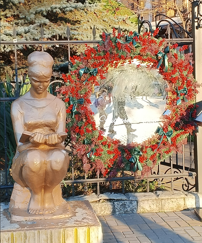 А напротив этого самого места для мечты стоит памятник читающей девушке. И возле него установили великолепную зеркальную инсталляцию.