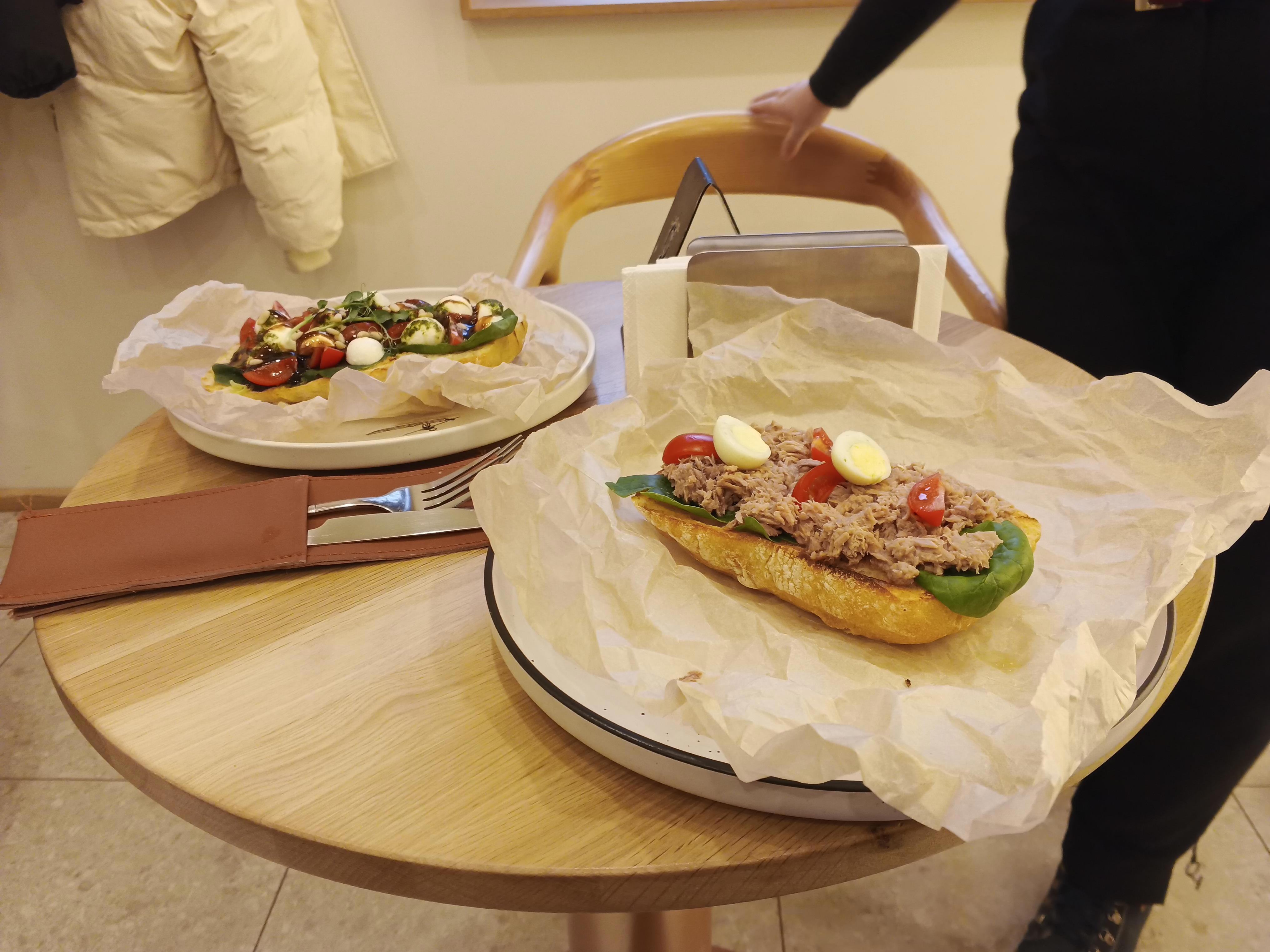 Да, заказ нам обошёлся не сильно дёшево, но мы кроме кофе и пирога взяли ещё по отличной чиабатте. Одну с несколькими видами сыра и соусом, а вторую с тунцом...