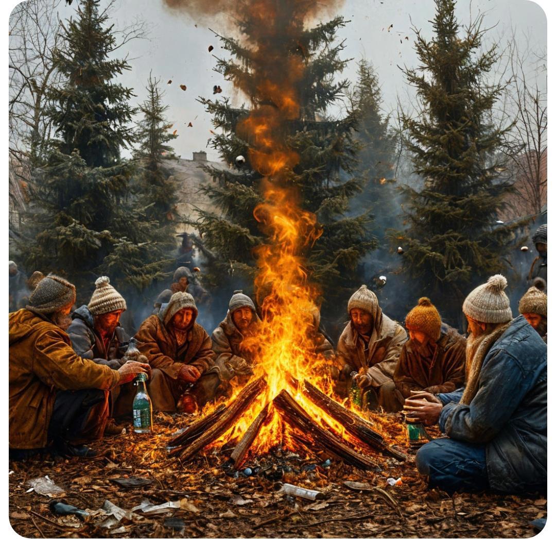 Две большие елки из общественных зданий, демонтировали и увезли на свалку, три обычных отвезли в странные места именуемые «Пунктами сбора елок» . С двух этих пунктов елки увезли на явные свалки, а вот с третьего, странно одетые, странные люди, на абсолютно разболтанном и ржавом транспортном средстве вывезли елки на ближайший пустырь, где сложили их в кучу прихлёбывая дурнопахнущую жидкость из бутылок.