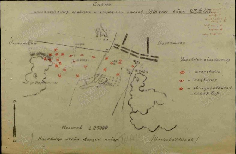 Схема расположения подбитых и сгоревших танков 10 гв. отпп в бою