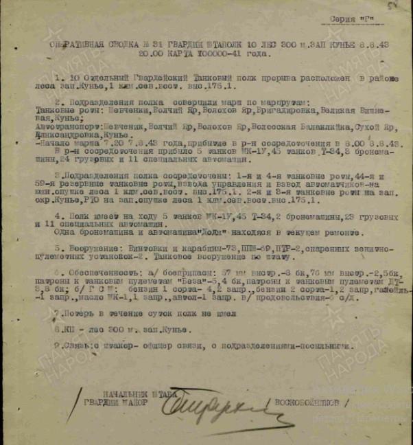 Боевые донесения, оперсводки. № документа: 31, Дата создания документа: 08.08.1943 г.