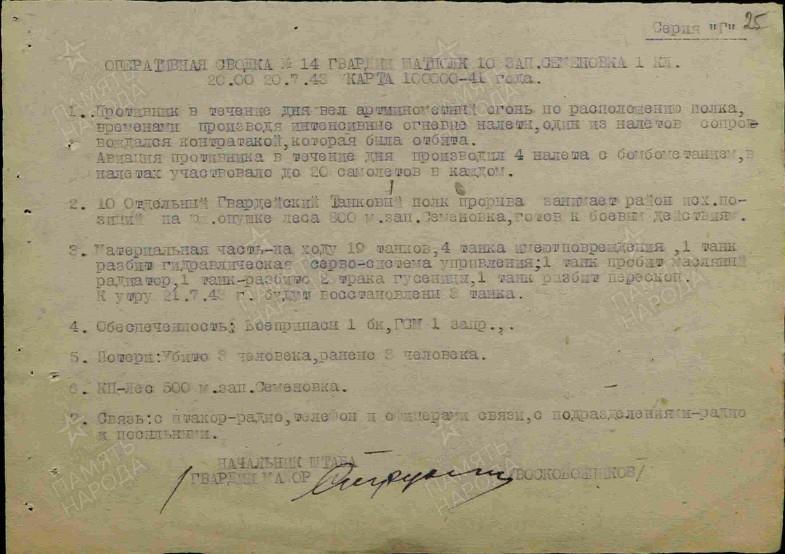 Боевые донесения, оперсводки. № документа: 14, Дата создания документа: 20.07.1943 г.
