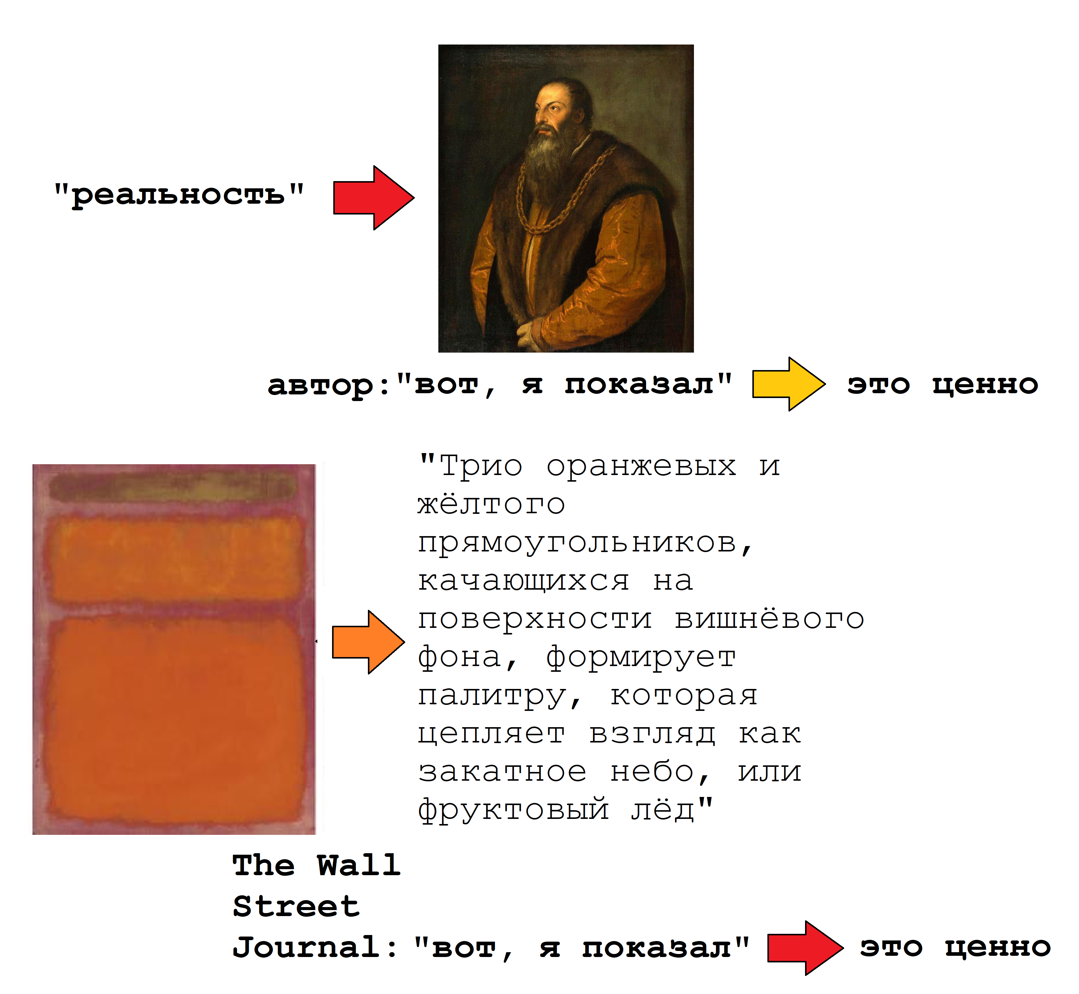 "— Так, но не совсем, — ответила Мара. — Когда дикарь рисовал бизона на стене пещеры, зверя узнавали охотники и делились с художником мясом. Когда Рембрандт или Тициан показывали свою картину возможным покупателям, вокруг не было кураторов. Каждый монарх или богатый купец сам был искусствоведом. Ценность объекта определялась непосредственным впечатлением, которое он производил на клиента, готового платить. Покупатель видел удивительно похожего на себя человека на портрете. Или женщину в таких же розовых целлюлитных складках, как у его жены. Это было чудо, оно удивляло и не нуждалось в комментариях, и молва расходилась именно об этом чуде. Искусство мгновенно и без усилий репрезентировало не только свой объект, но и себя в качестве медиума. Прямо в живом акте чужого восприятия. Ему не нужна была искусствоведческая путевка в жизнь. Понимаешь? <...> Последние полторы сотни лет искусство главным образом занимается репрезентацией того, что не является непосредственно ощутимым. Поэтому искусство нуждается в репрезентации само."