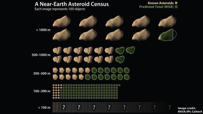 На 2012 год НАСА оценивало количество и размеры открытых и неоткрытых околоземных астероидов вот так: