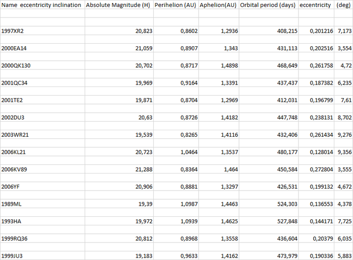 В далеком 2008 году на форуме журнала "Новости космонавтики" пользователь Имхотеп подобрал для меня из таблицы НАСА по околоземным астероидам подходящие под промежуточные станции для переброски колонистов на Марс. Тогда их было известно менее 6000.