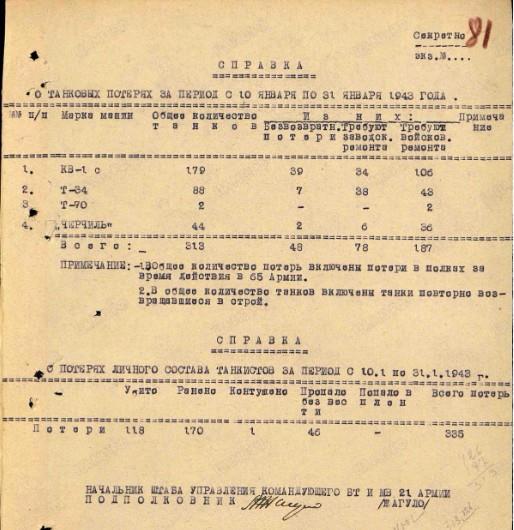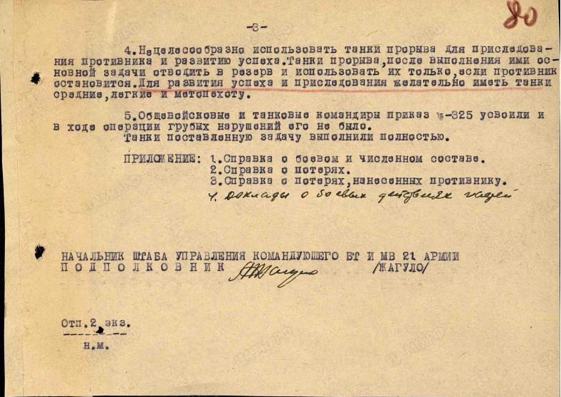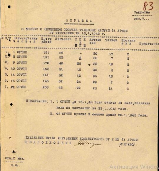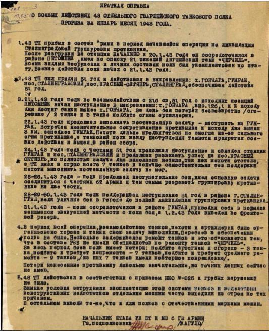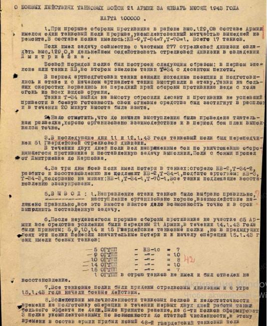 От автора. Судя по этому документу, из 6 полков сделали 3, вопрос - нахрена? В результате количество снова перешло в "качество", причём очень быстро и от каждого полка осталась одна рота, состоящая максимум из 5 танков. Только теперь этих рот осталось три, а могло быть шесть. По штату в полку было всего две ремлетучки и быстро отремонтировать несколько танков, ремонтники просто технически не могли, как ни старались. Тем более некоторые вышестоящие мудаки-командиры времени на приведение полка в порядок попросту не давали. Например комдив 51-й Гвардейской стрелковой дивизии своим самодурством и тупорылостью угробил ни один приданный полк прорыва. Как количество переходило в "качество", а из целого полка получалась целая рота, видно на примере 48 отдельного Гвардейского танкового полка прорыва.