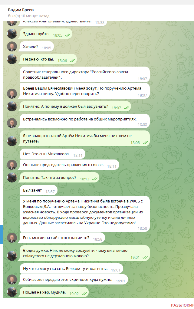Автор: Алексей ЕвтушенкоИтак. "Союз писателей России" меня развести на бабки пытался. "Собянин" пытался. Теперь, вот, "Союз российских правообладателей". Якобы по поручению аж самого сына Никиты Михалкова. Даю скрин нашей милой беседы. Люди, не ведитесь.