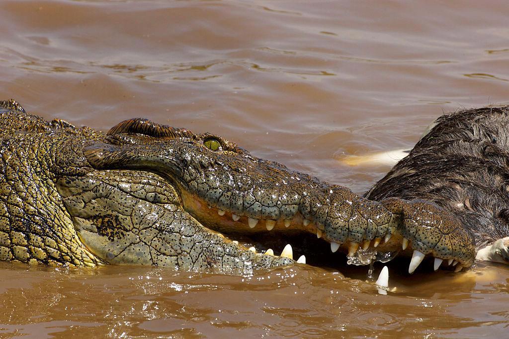 Нильский крокодил пожирает мертвого гну. Заповедник Масаи-Мара, Кения.