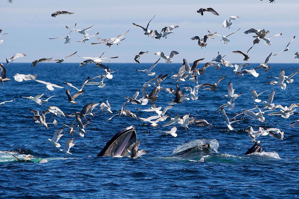 Горбатые киты во время кормежки у берегов мыса Кейп-Код. Новая Англия, США.