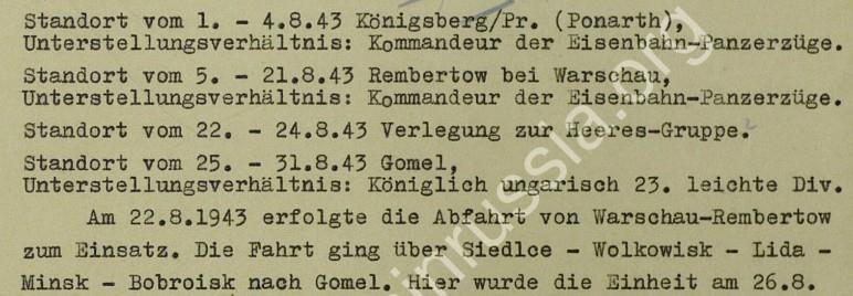 На начальном этапе блицкрига действовал на северном фланге 4. Танковой группы, атакующей Ленинград. Поезд работал на территории Латвии и Эстонии. Осенью 1941 года действовал в районе Витебска и Смоленска. В начале 1942 года он поддерживал операции 11-ой танковой Дивизии. 10 октября 1942 года во время бомбардировки на станции Вязьма был поражен авиабомбой и поврежден. Ремонт поезда выполнили мастерские в Кенигсберге. В период с декабря 1942 года по август 1943 года поезд был на модернизации. Как писалось выше уничтожен своим экипажем 27 июня 44-го в окрестностях Бобруйска.
