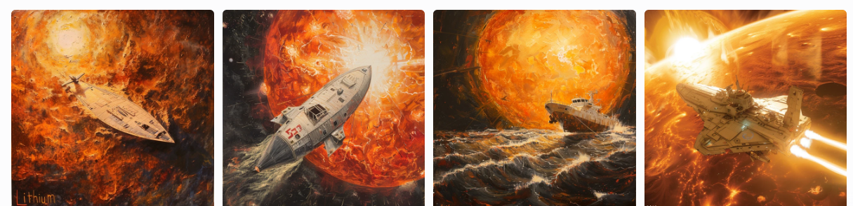 Первая картинка неплоха, но не похоже на Солнце, все остальные снова не в тему. И не забываем, что когда вы используете в одном предложении "корабль" и "Солнце" то корабль может выглядеть как космический, а не плавучий (в данном случае кстати ИИ понимает, что мы говорим о Солнце, как о космчиеском объекте, а не как о детале пейзажа).