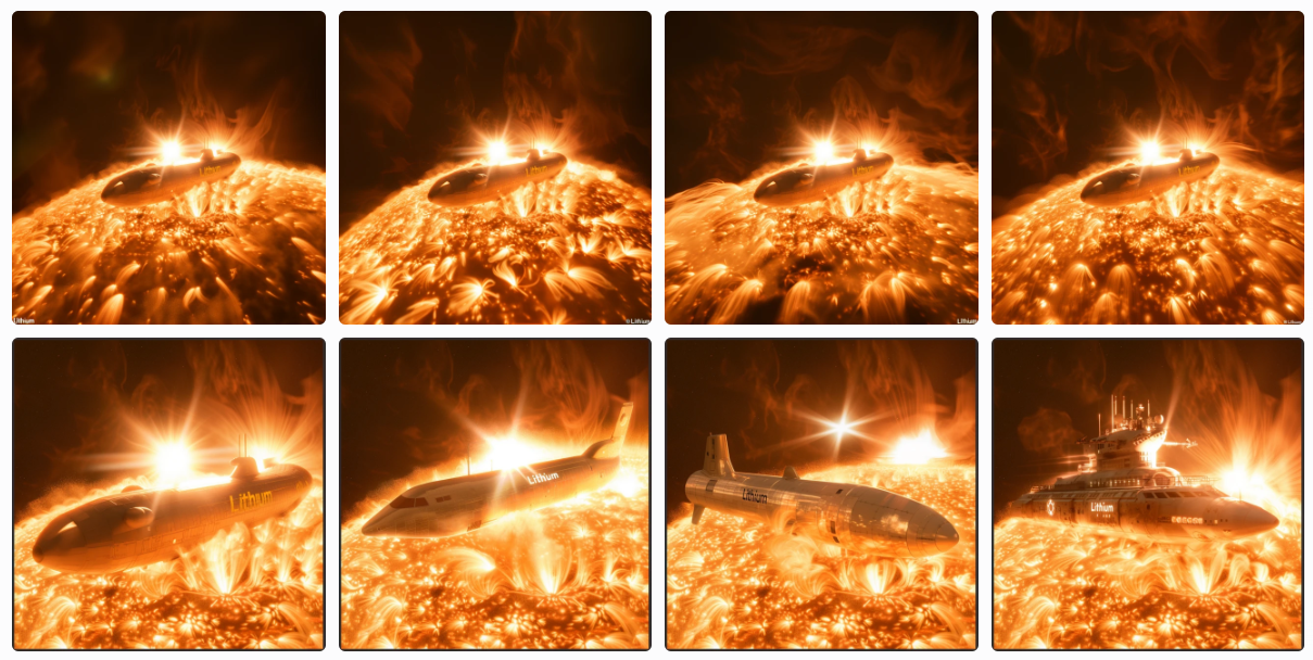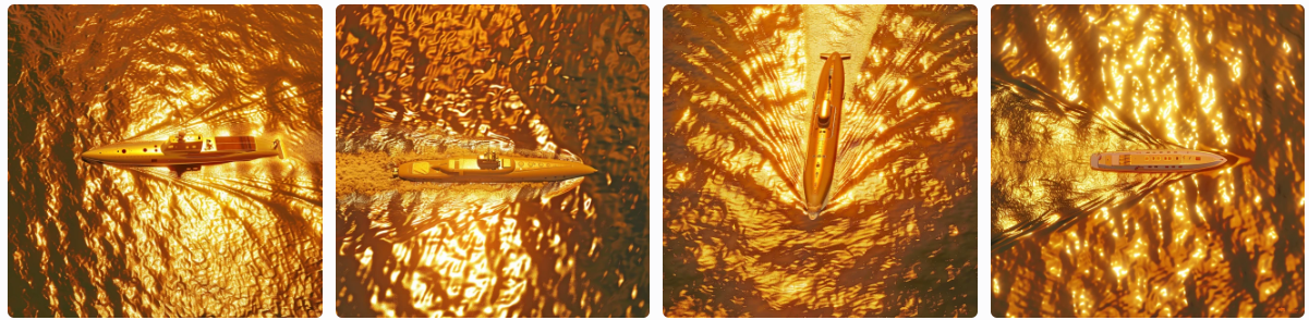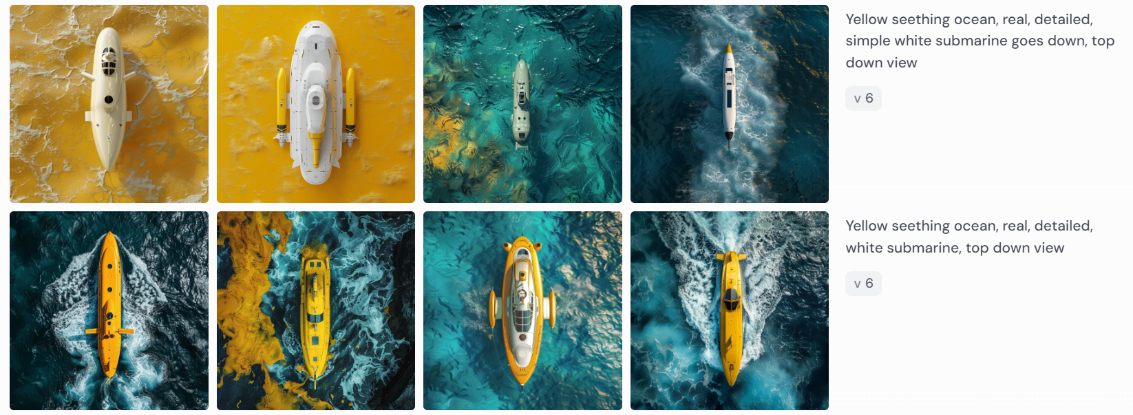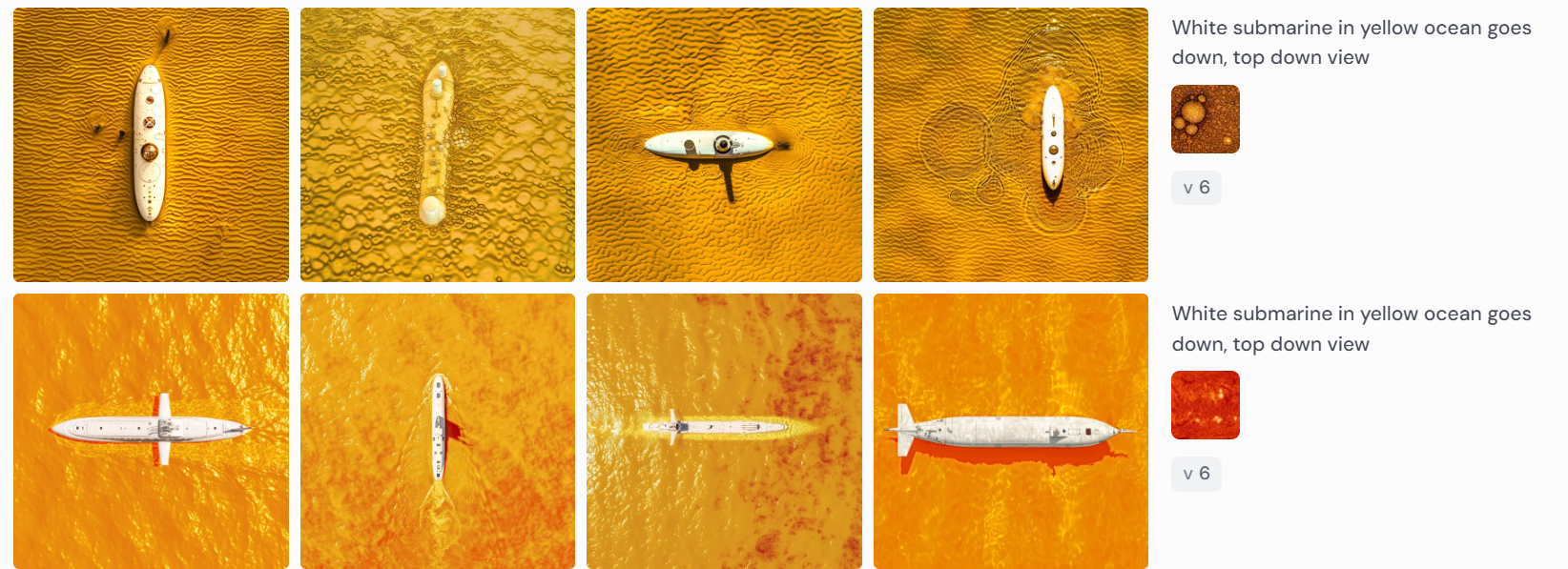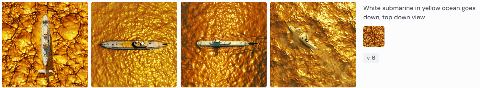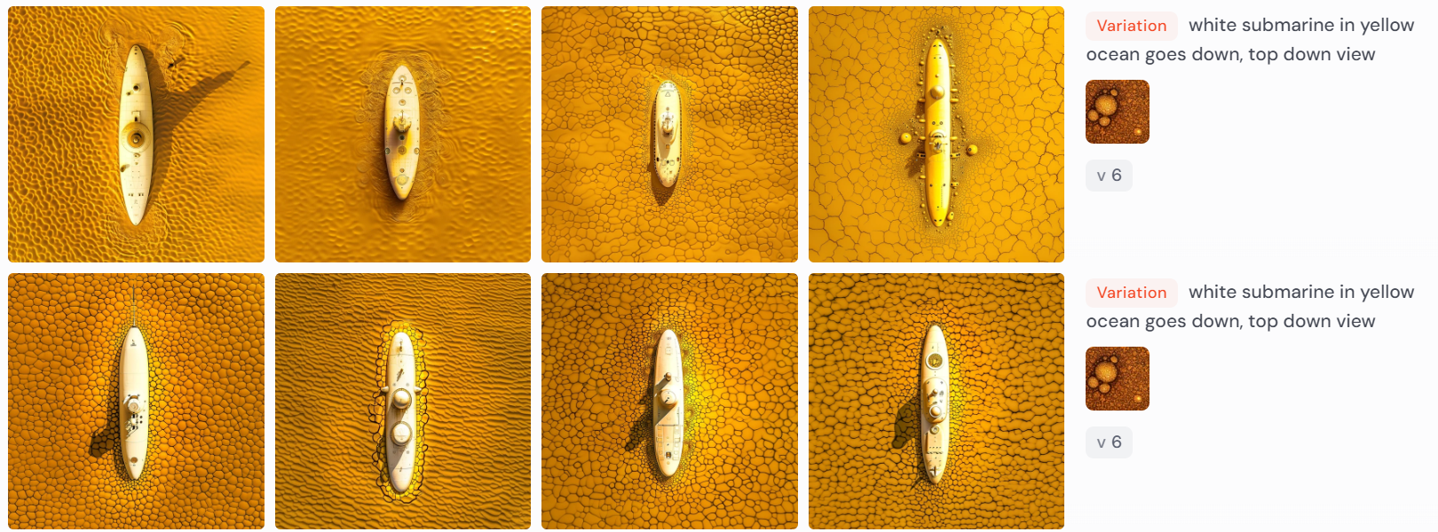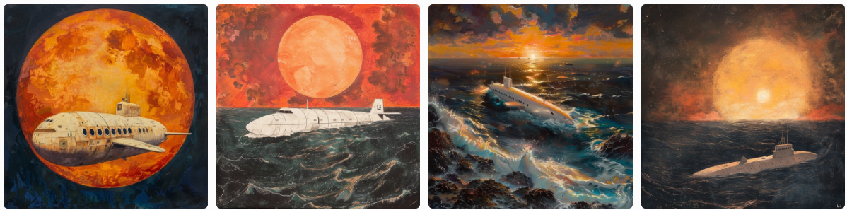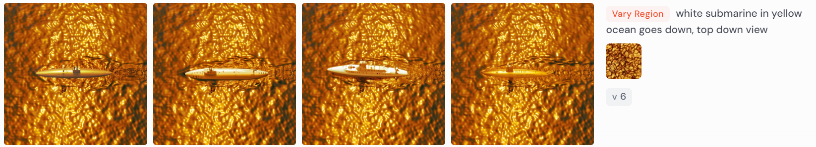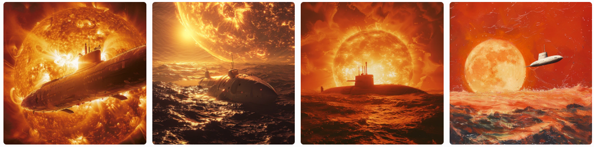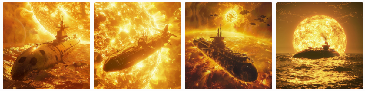 После этих экспериментов я понял, что всё-таки мне больше нравится другая "поверхность Солнца" так как без контекста в этих изображениях может показаться, что это просто желтая вода. Я попросил ИИ сделать разные варианты подлодки, использую инструмент Vary region: