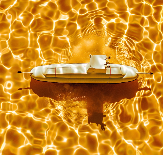 white submarine in yellow ocean goes down, top down view + нужная картинка-образец