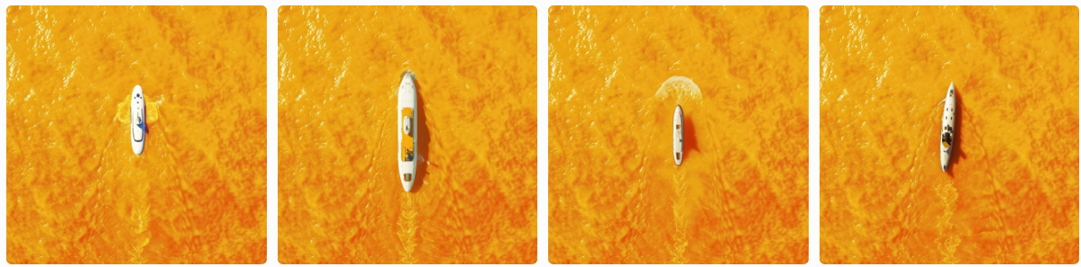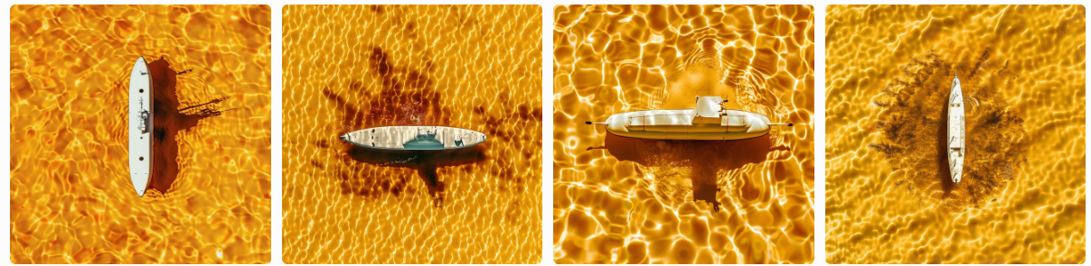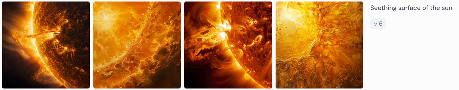 Увы, но только 1 изображение содержит белую лодку, но она почему то летит... Солнце все также отдельно. И я понимаю ИИ - ведь он учился на изображениях миллионов людей и вряд ли многие фотографировали или рисовали "бурлящую поверхность Солнца"