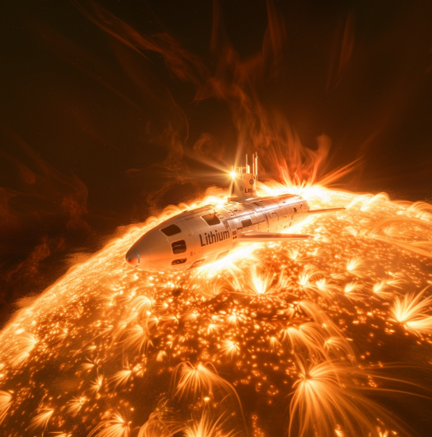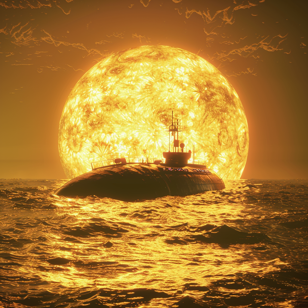 Взгляд мой пал на этот вариант: мы видим типичную солнечную поверхность, она похожа на океан, простая не вычурная подлодка, и еще тень отбрасывает (не совсем реалистично, ведь мы же на Солнце, но смотрится красиво):