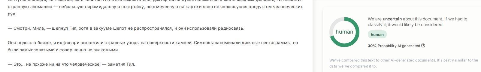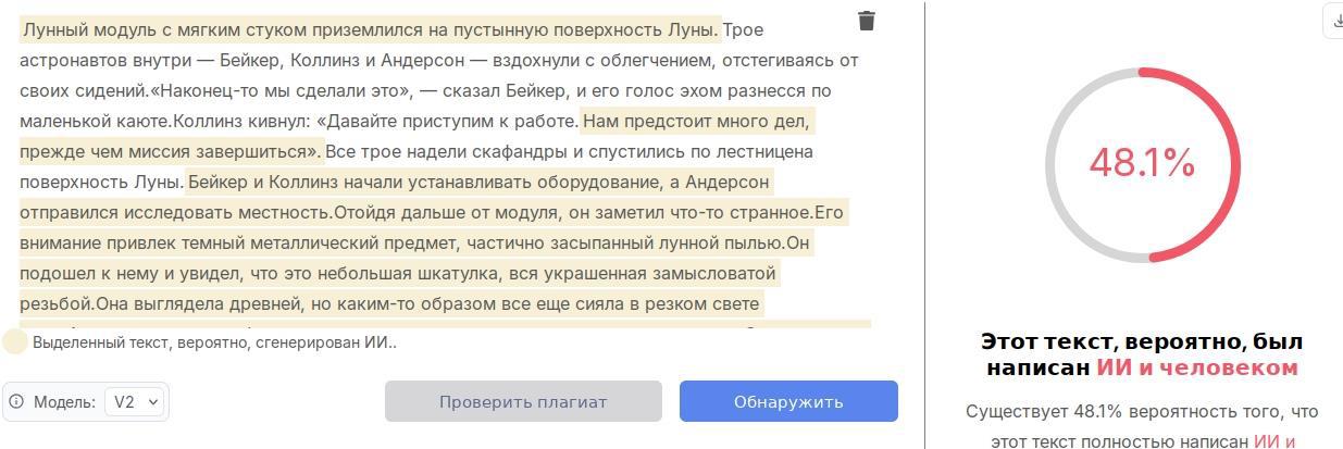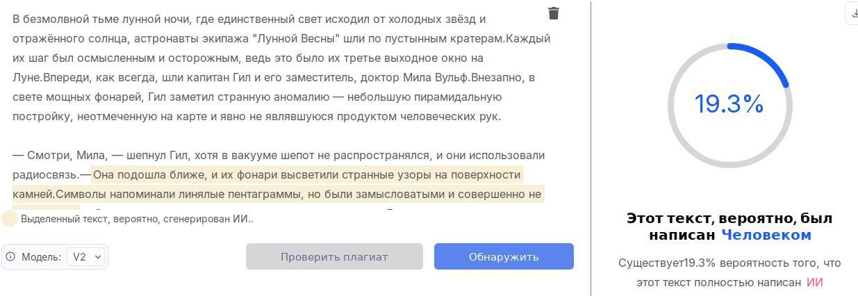 А вот я уже русскоязычную ИИ модель попросил побредить на всю ту же тему "оборотни на луне" и передал текст в детектор: