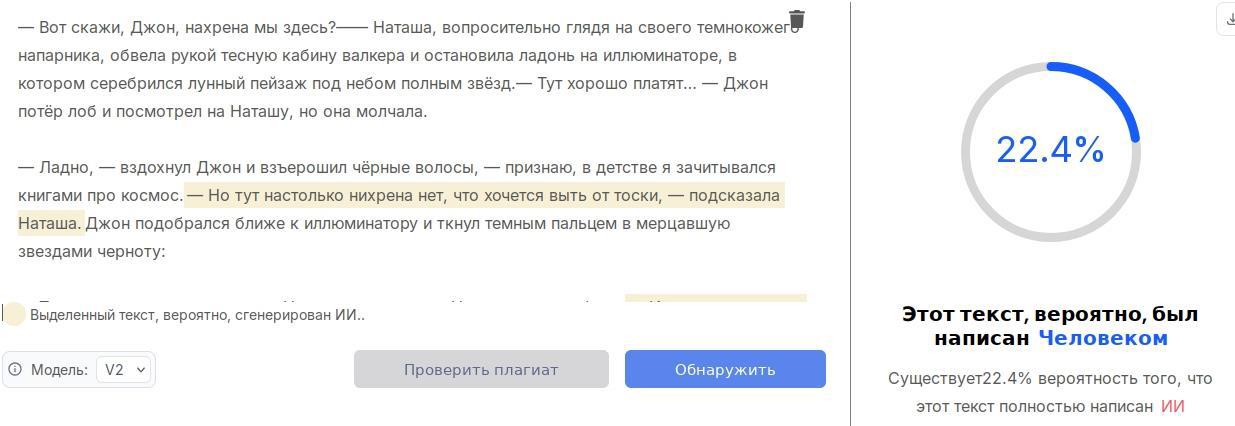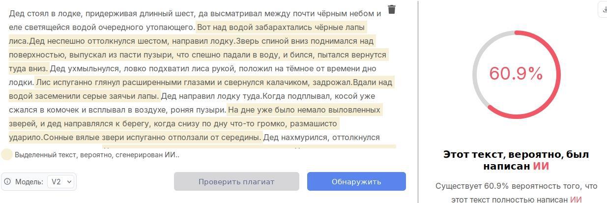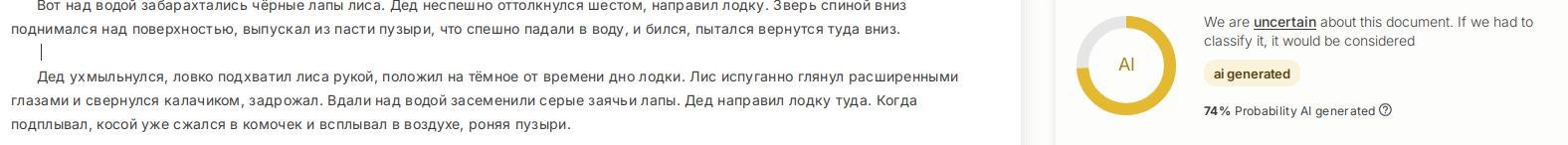 Берём другой сервис, поддерживающий русский язык и даже выделяющий ИИшные фразы, и получаем для вполне себе руками написанного рассказа: