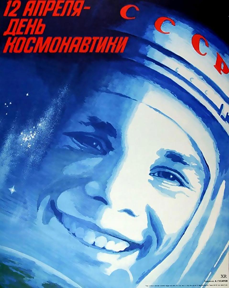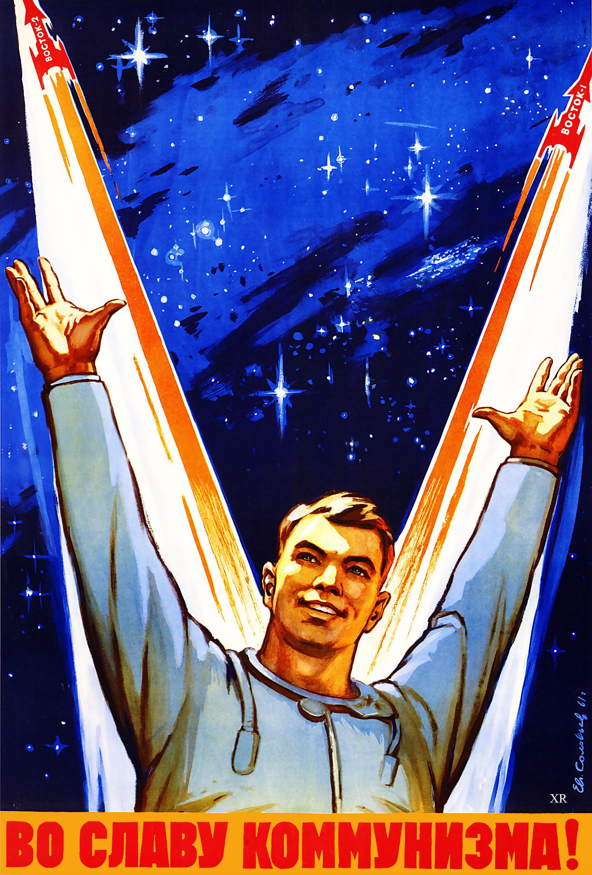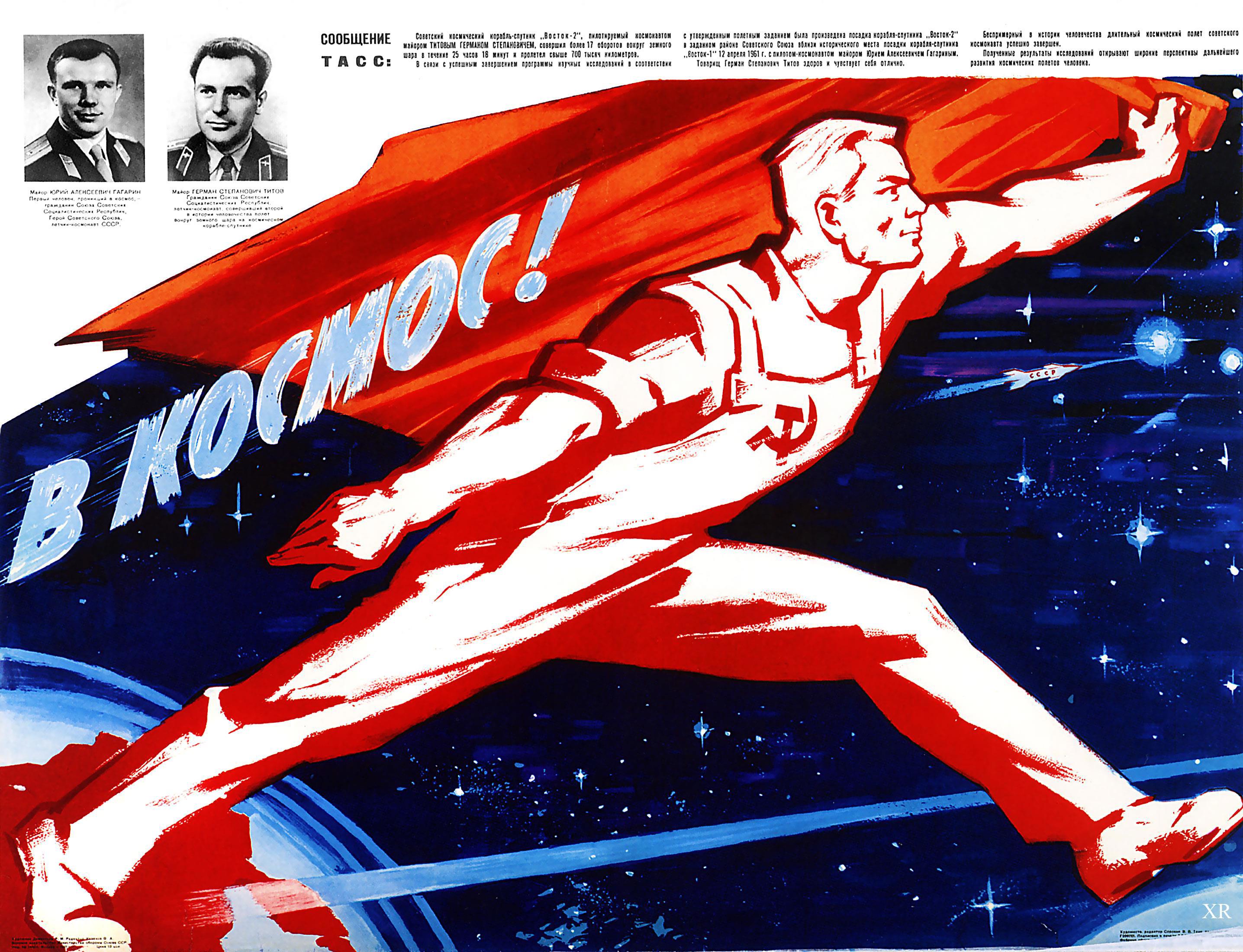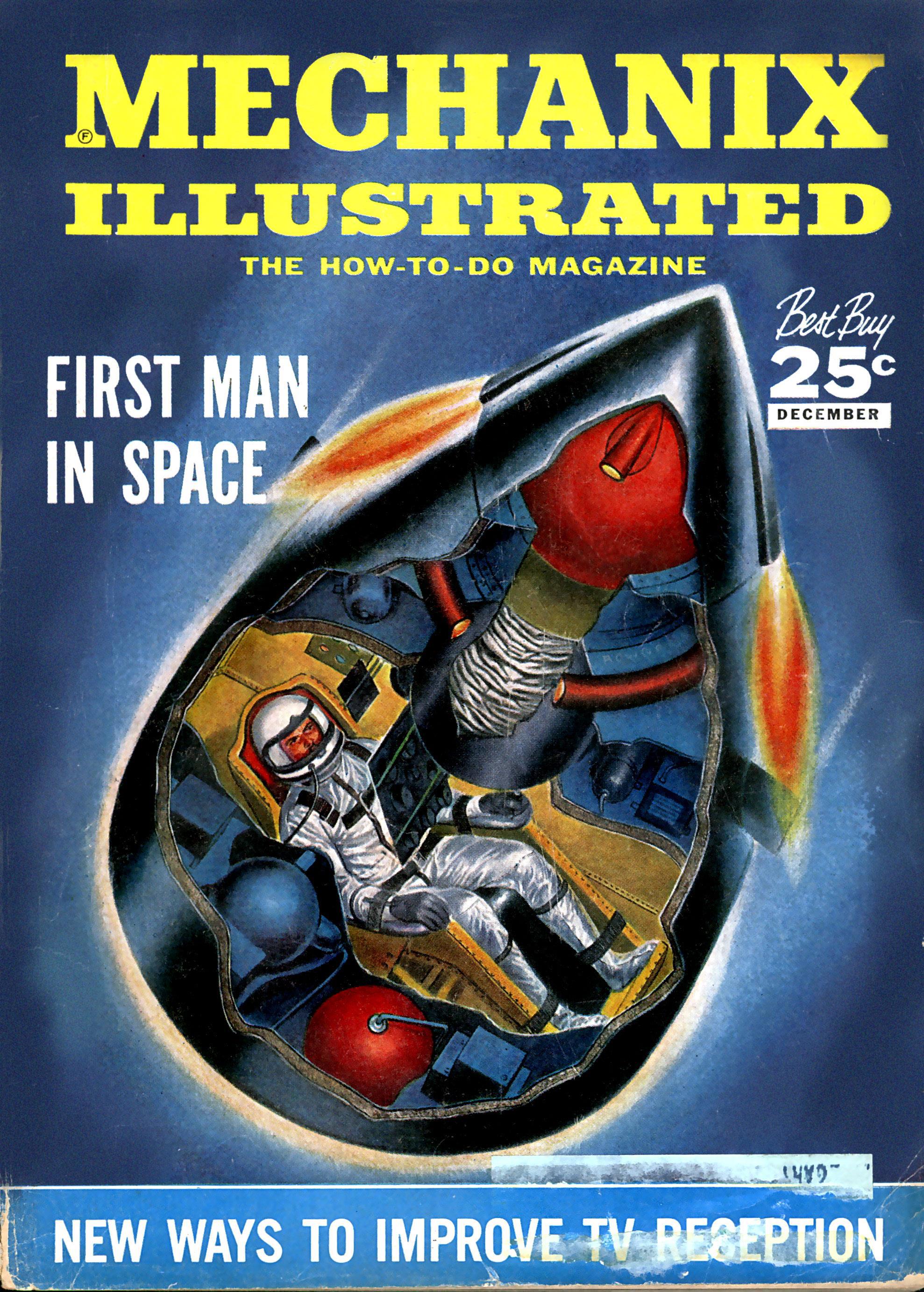 "Механик илюстрэйтед". А здесь вообще некий анонимный "первый человек в космосе". И сам космонавт и спускаемый аппарат максимально абстрактны. На американскую капсула точно не похожа, но и на спускаемый отсек "Востока" тоже не совсем.