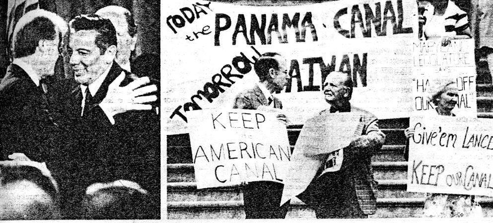 Картер и Торрихос на подписании новых договоров. Протесты американцев на ступенях Капитолия