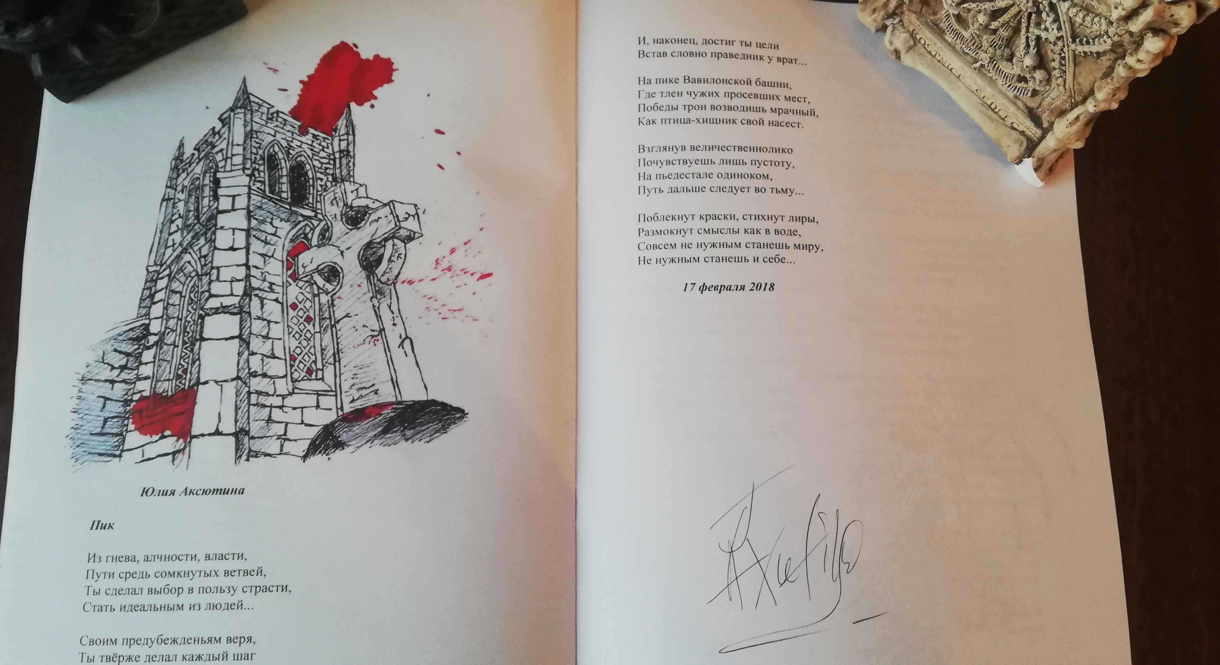 Автор: Тимур МарковА меня тут опубликовали в поэтическом сборнике!) Звучит громко, на деле это лишь небольшая внутренняя брошюра готического комьюнити Москвы, но все равно весьма приятно. Я, правда, и здесь сумел отличиться - мой стих единственный на английском из всего сборника, да и это не совсем стих, а текст песни. Правда, музыки на него пока нет, но я работаю над этим) И еще он единственный не про вампиров. Короче - я неформал среди неформалов))) Оформление заслуживает отдельной похвалы - все иллюстрации нарисованы от руки.