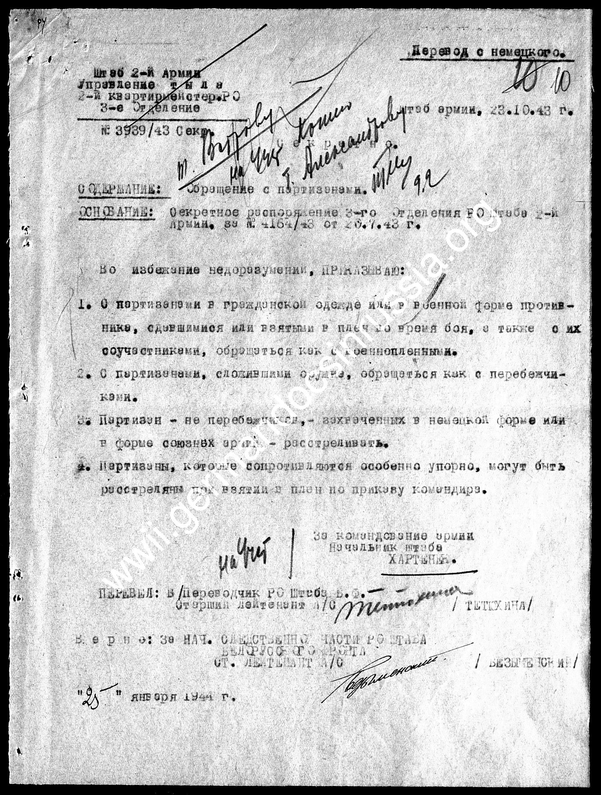 С бандитами думаю и так знаете. Слово партизаны применялось очень редко, в основном среди всякой контрразведки, остальным они запрещали его применять. А те и рады. Бандиты и всё. Это не солдаты, это люди в гражданской одежде причиняющие вред вермахту, не попадающие ни под какие конвенции, поэтому разговор короткий - убить. Желательно бы конечно допросить, но это заморачиваться с конвоем, доставкой. Пристрелить проще.