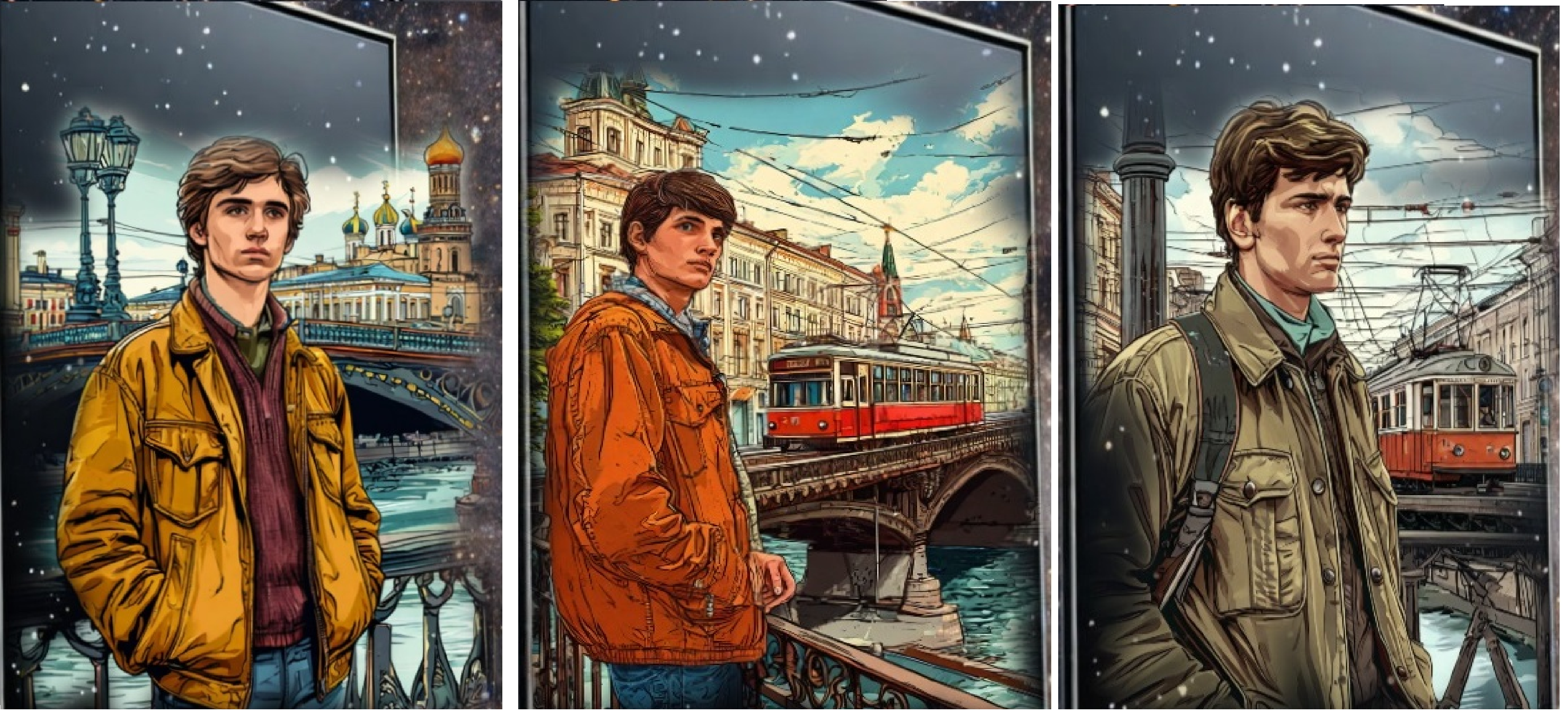 Лицо с третьего лучше подходит к теме книги: лучше передан скептицизм ("- И что мне со всем этим делать?") человека, пережившего 90-е и вынужденного ещё раз взирать на бурление перестройки. А вот для фона больше подходит идея с первого: и перспектива более узнаваемая, и "смешение эпох" (выход картинки за рамки) показано выпуклее. Правда, трамвай с третьего лучше намекает на факт переноса.