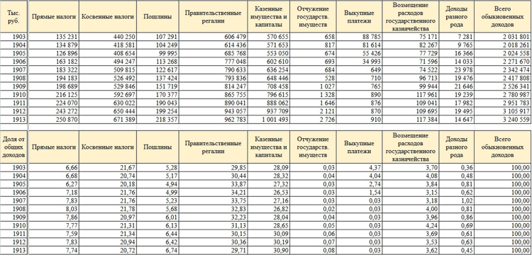 Около 60% доходов представлено всего тремя статьями - казённая винная операция, казённые железные дороги и таможенные доходы.