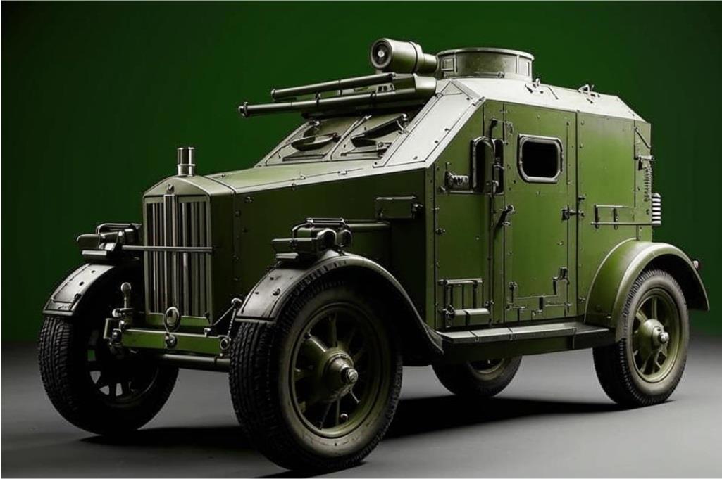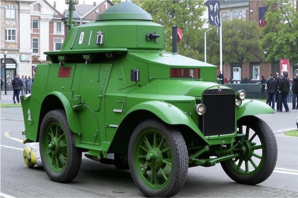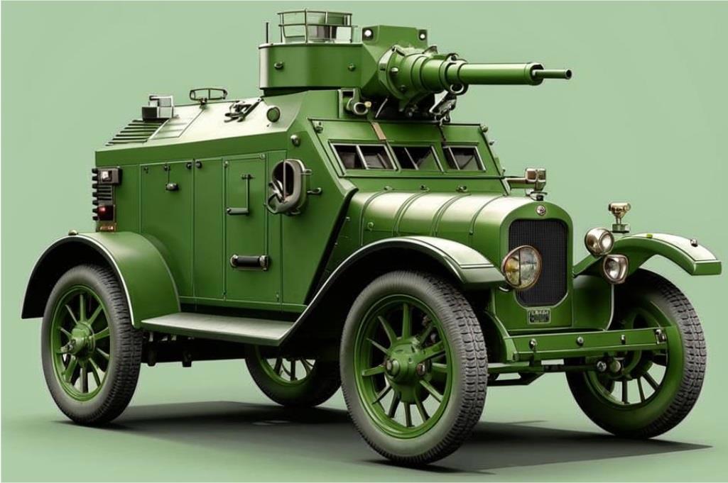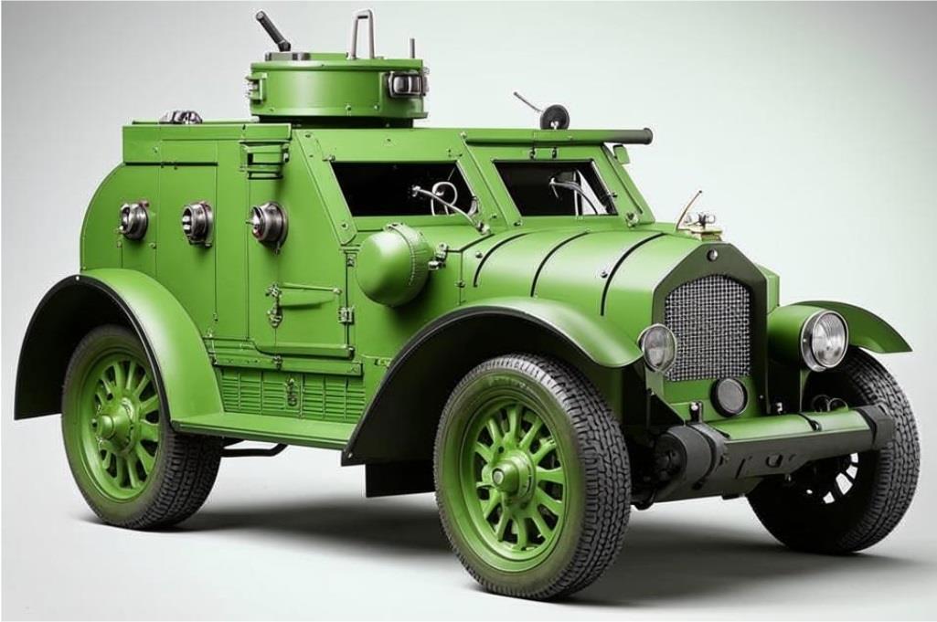 Автор: НогицунеКак многие мои читатели уже знают, у меня сейчас в работе цикл "Коминтерн 2.0" https://author.today/work/413153 . По ходу дела ГГ уже переместил я прошлое где вовсю зачищает РИ от вредоносного элемента, мешающего ему выполнить задание, а заодно прогрессорствует "по чёрному". Ну как по чёрному. Много, но в рамках возможностей тех лет. Атомных подводных лодок не строит, но вовсю развивает автомобильную промышленность, которую он сделал базой для создания экономического базиса для государственного переворота. В общем там всё просто и сложно одновремено. Жизнь. Однако имея базой автопром не попытаться сделать бороневик... Это не по нашему. И вот он сделал там первый броневик. Пока что он его использует не в боевых действиях, а для перевозки ценностей. Организовал там охранную структуру, которая в свою очередь должна будет стать военной базой для гос переворота. И вот этот броневик эти ценности перевозить и должен. И захотелось мне выложить арт этого броневика. Порадовать себя и читателей. Но... Но на моём пути встала нейронка. Четыре часа, чтоб.... Четыре часа вчера крутил её по всякому. Основной запрос сформулировал следующий "Бронеавтомобиль четыре колеса, башня, пулемёт, зелёный, Первая мировая война". Ну там были ещё вариации. Сейчас приведу то, что хотя бы на что-то похоже. Там была ещё тьма уродцев всех видов, кстати был бы классный паноптикум. В следующий раз отберу самых самых уродов и выложу. Но пока то, что хотя бы напоминает то, что нужно.