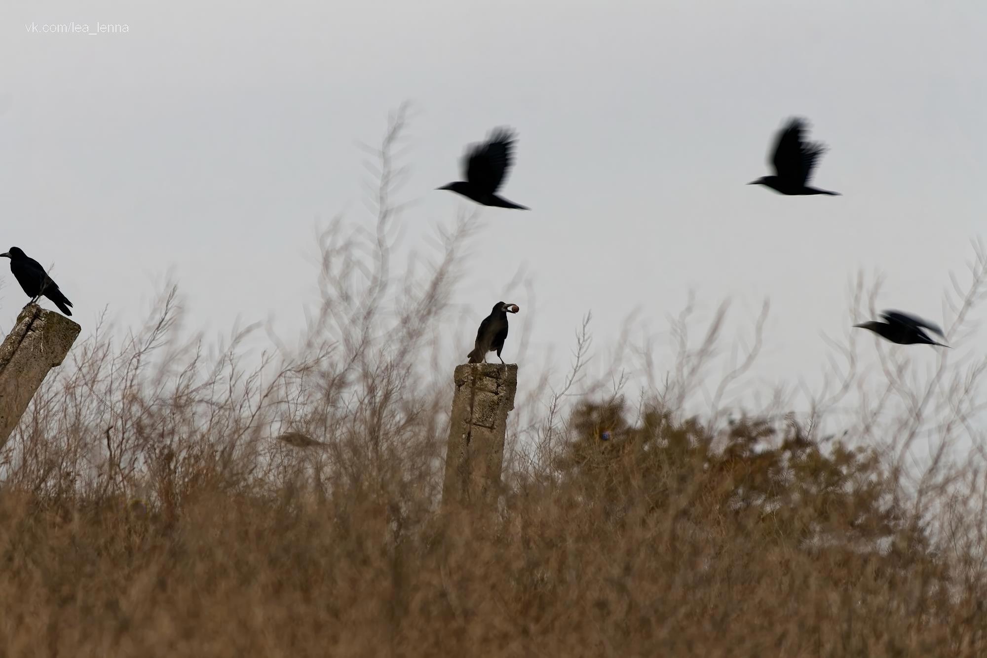 Травы и птицы. Внезапная ворона с орехом, их у меня тоже целая стая, разных, в разном освещении.