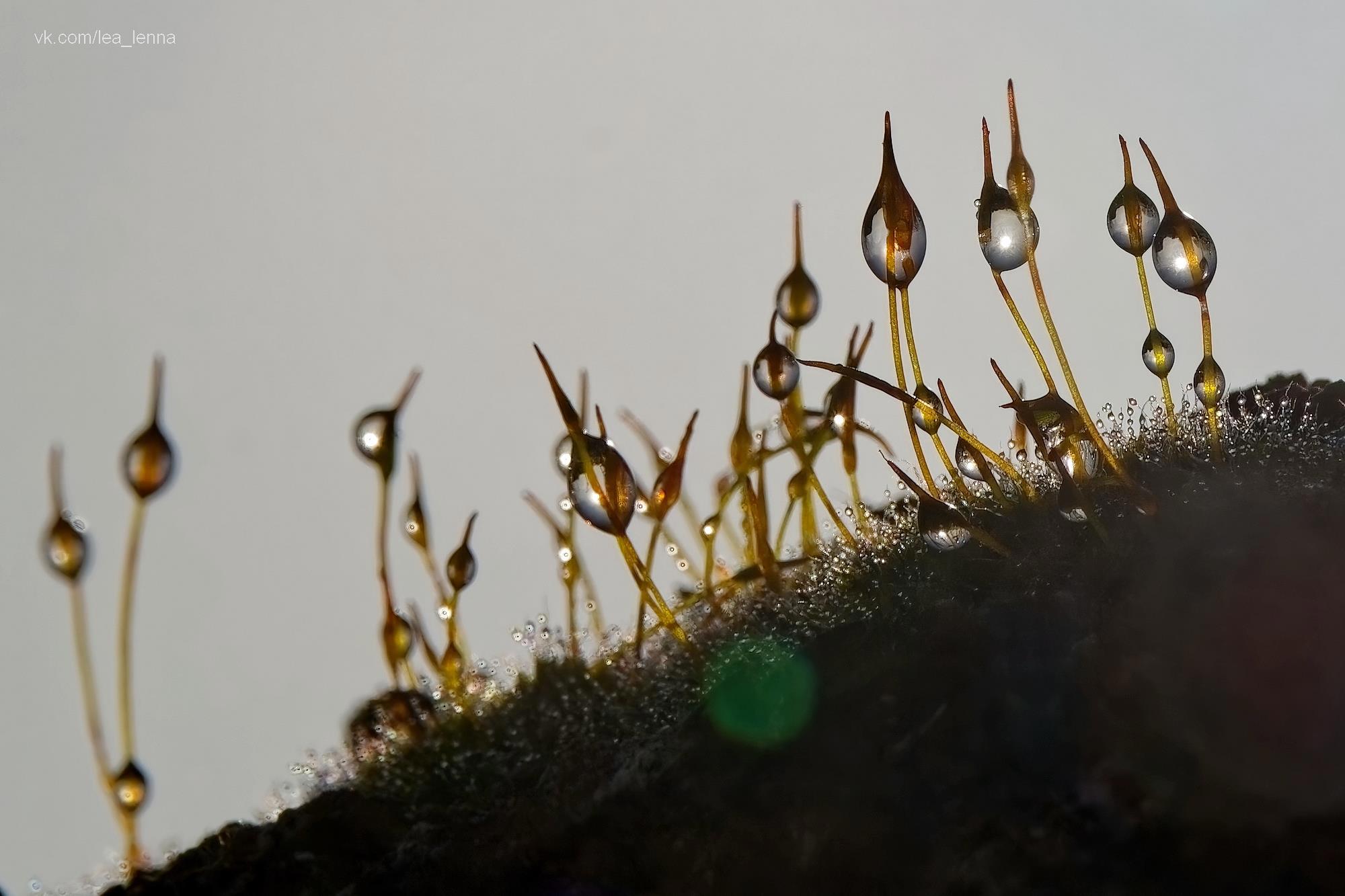Капли дождя на молодых стрелочках кукушкиного льна. И сами моховые подушки усеяны совсем уж крошечными капельками.