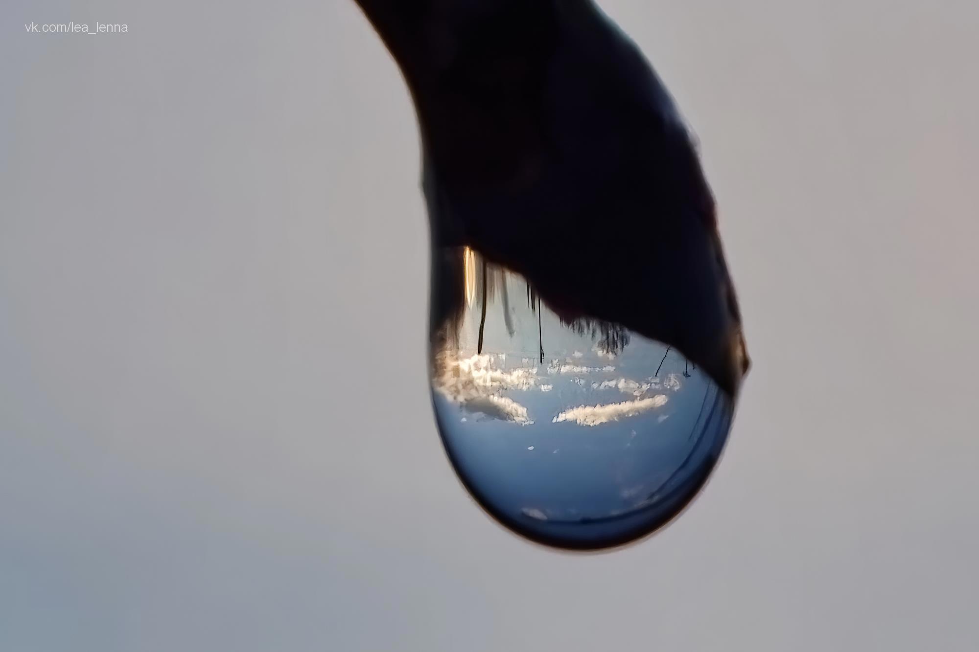 Снимок из альбома "Капли-миры". Чаще снимать крупные капли после дождя приходится именно в пасмурную погоду, но иногда дождь прошел и солнце вышло, тогда в капле отражается синее небо, полное облаков.